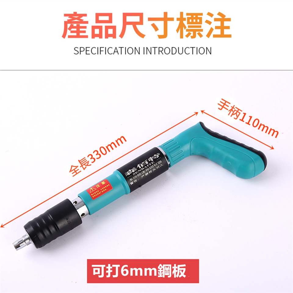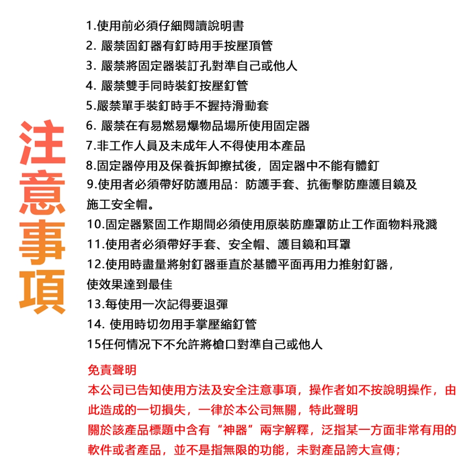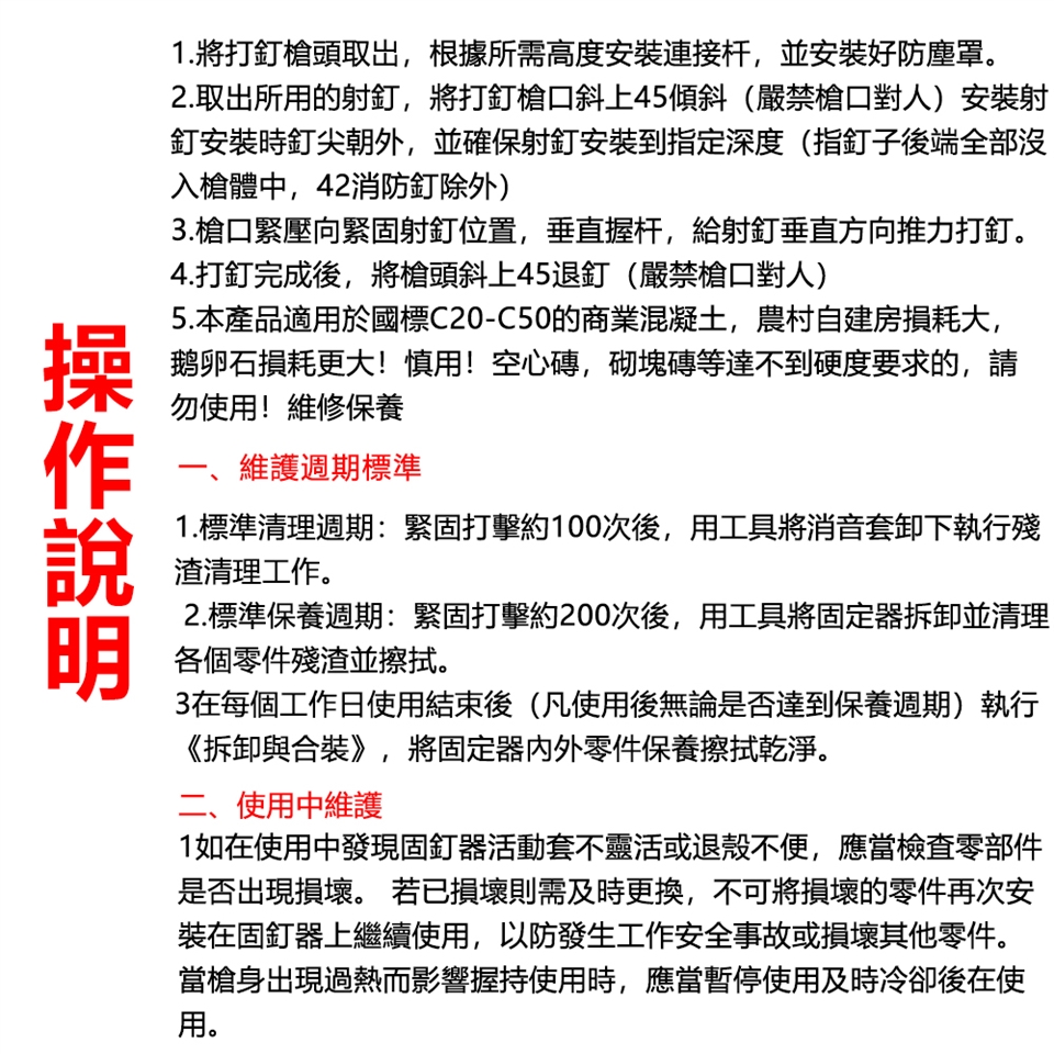 1.將打釘槍頭取出,根據所需高度安裝連接杆,並安裝好防塵罩。2.取出所用的射釘,將打釘槍口斜上45傾斜(嚴禁槍口對人)安裝射釘,安裝時釘尖朝外,並確保射釘安裝到指定深度(指釘子後端全部沒入槍體中,42消防釘除外)。
