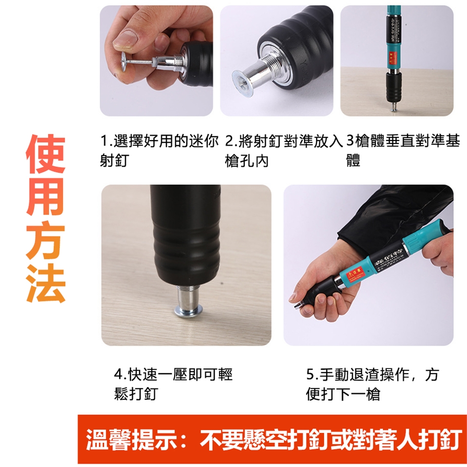 3.槍口緊壓向緊固射釘位置,垂直握杆,給射釘垂直方向推力打釘。4.打釘完成後,將槍頭斜上45退釘(嚴禁槍口對人。