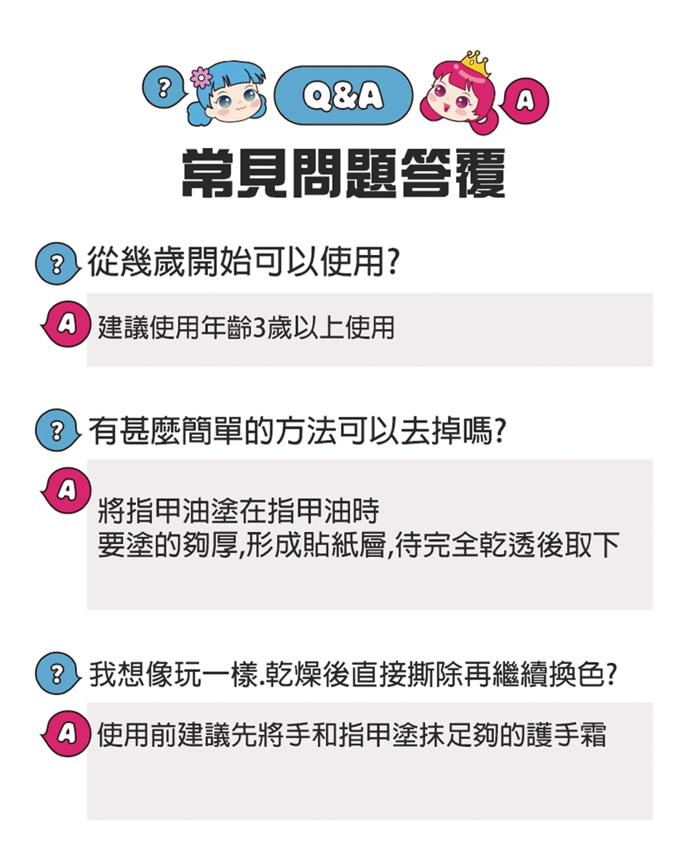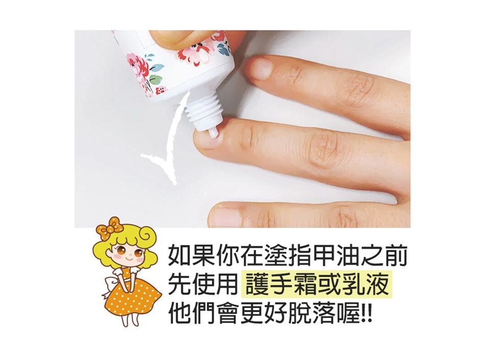 A : 使用之前請在指甲上塗抹護手霜,會更容易去除。