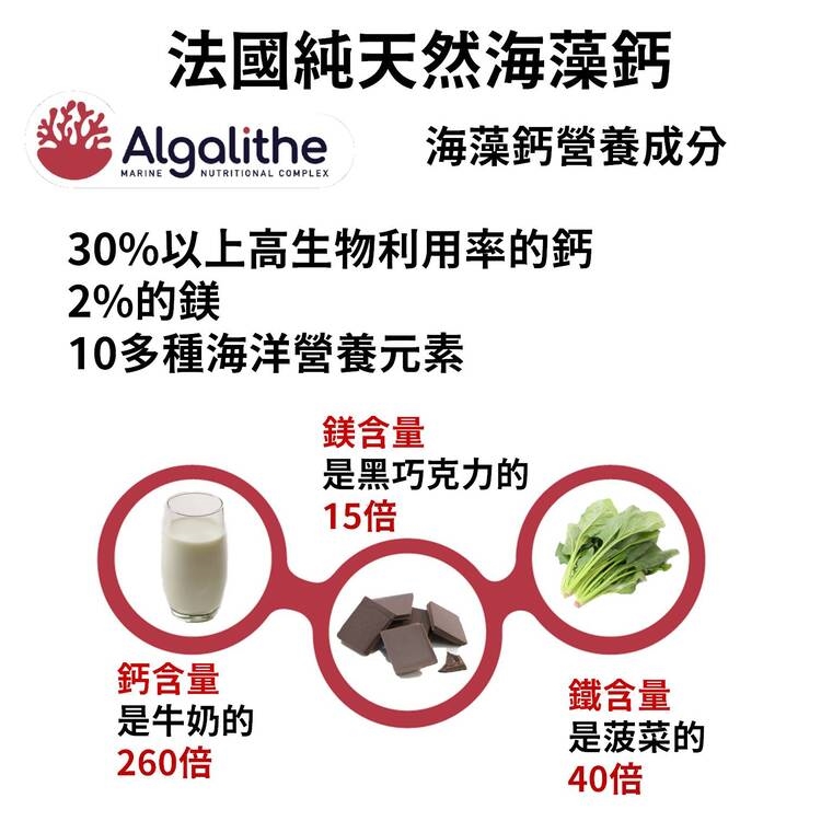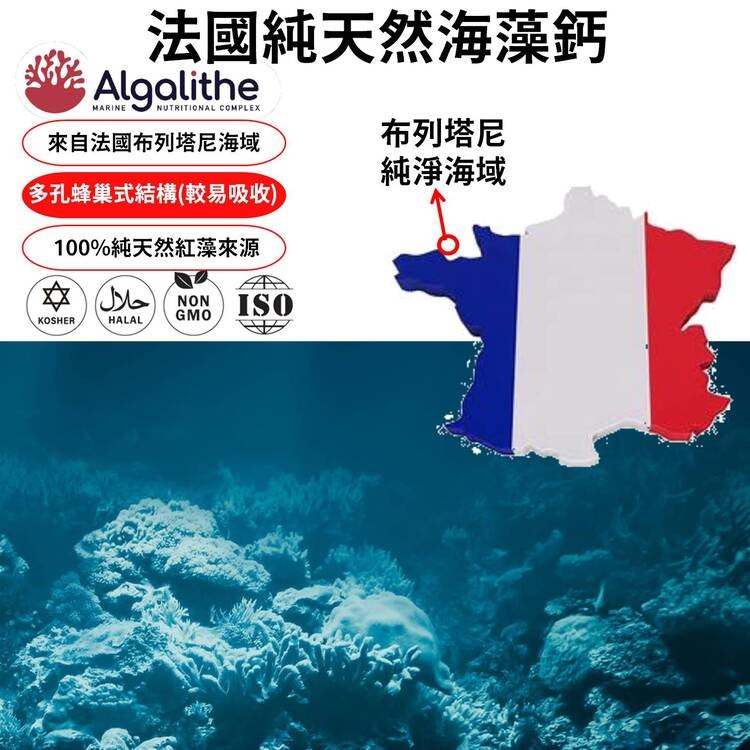★使用法國Algalithe天然海藻鈣(Algalithe使用源自法國西北部-布列塔尼海域的紅藻,該地的海水受到嚴密的保護,自古就有"奇蹟之海"的美譽)