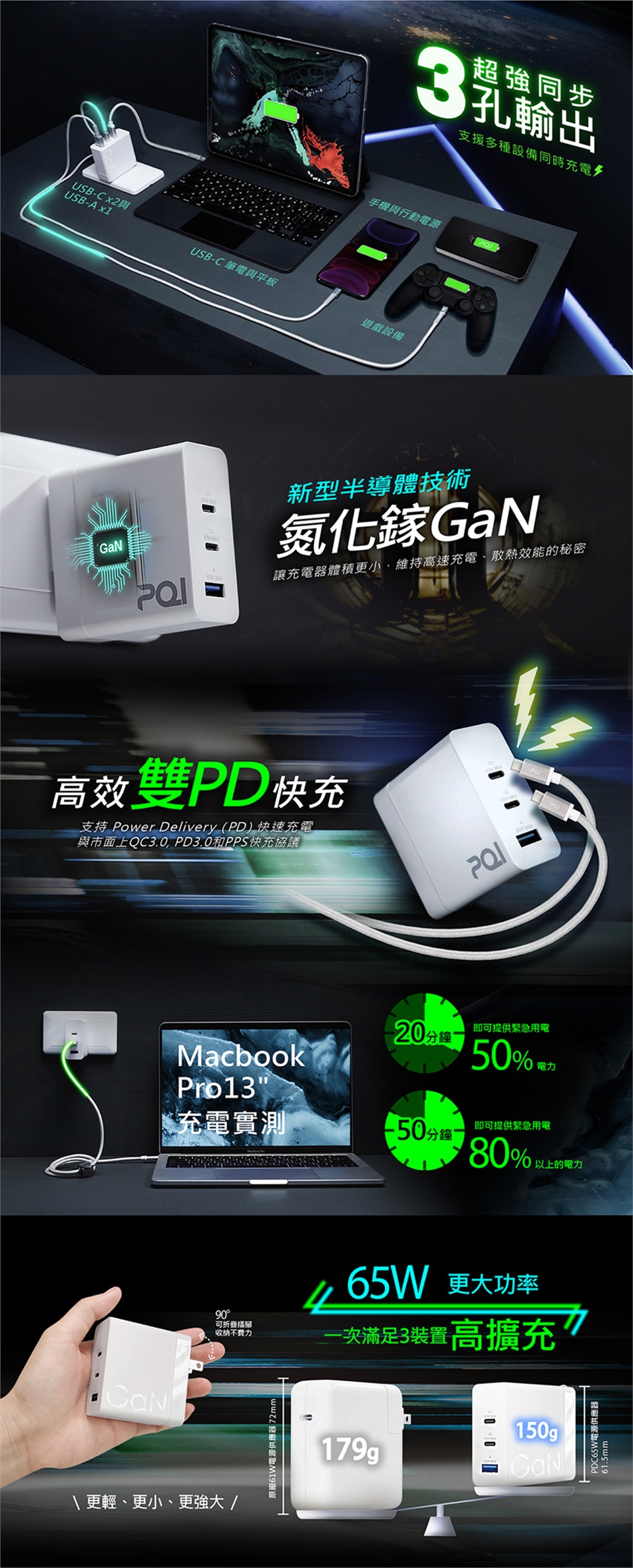 . 50分鐘可充滿80%電力,隨時支援手機、平板和筆電。