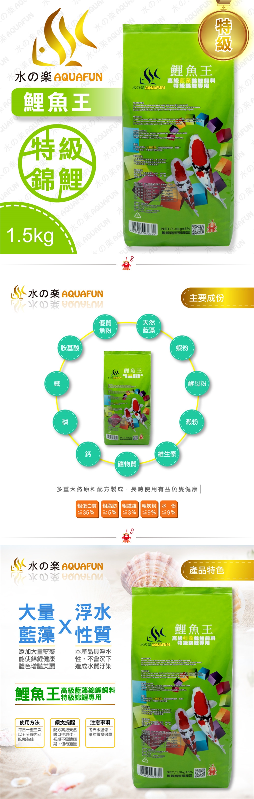 ● 商品名稱:水之樂 鯉魚王藍藻錦鯉魚飼料 1.5kg