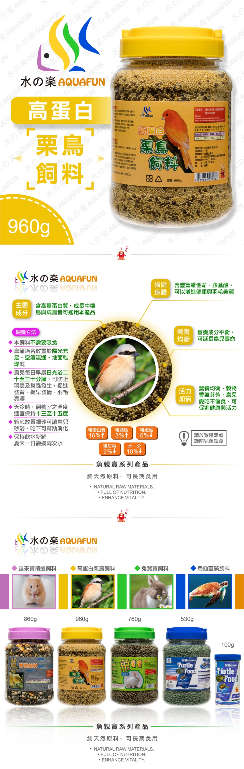 ● 商品名稱:水之樂 高蛋白栗鳥飼料 960g