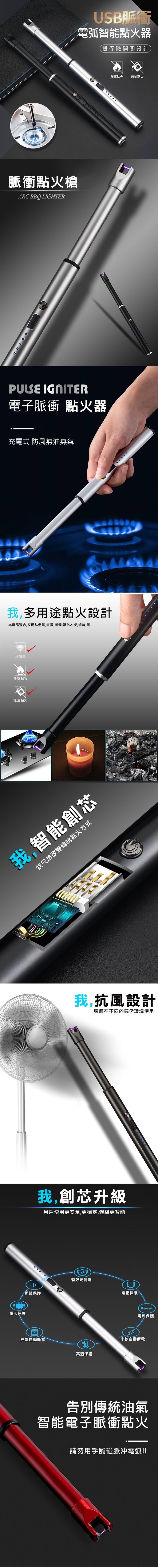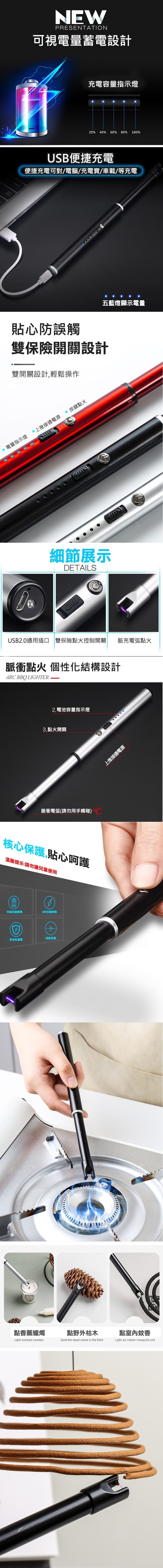 運用電弧高壓瞬間放電產生火花,長柄點火,安全不燙手,防風無明火,適合在不同環境使用,不需氣體燃料,環保無污染,10秒斷電設計,降低危險性,雙重開關,不怕誤觸點燃,使用超安心,USB充電,續航持久穩定
