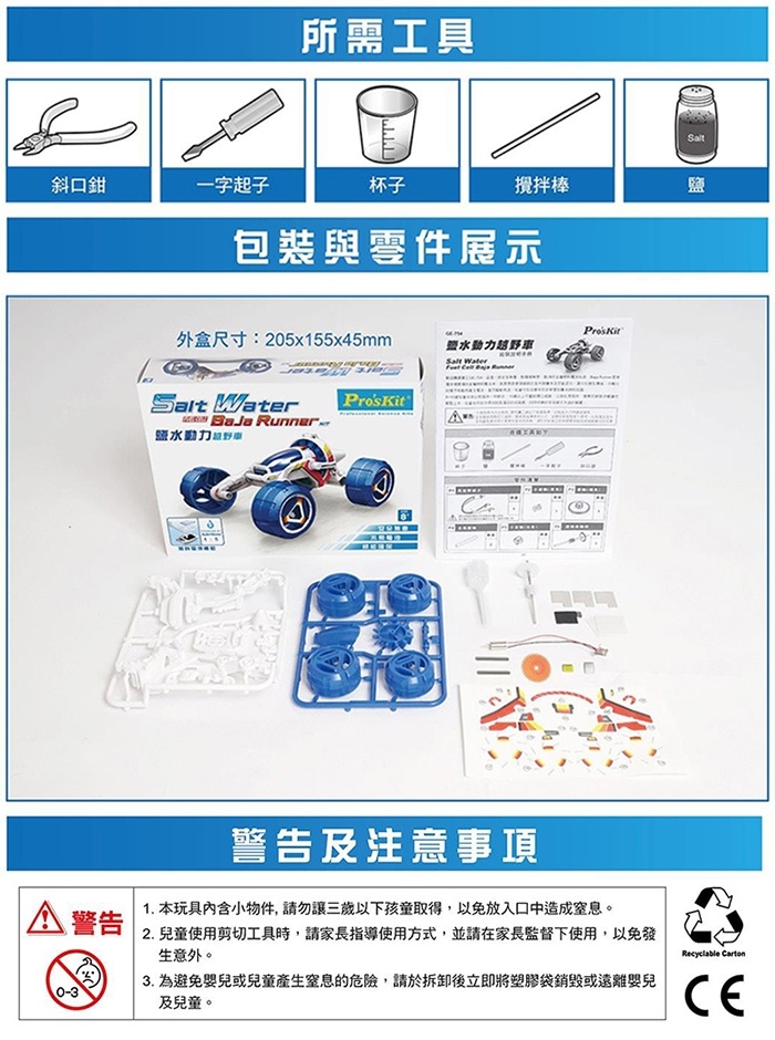 可組裝流線車體,可學習到鹽水與鎂片的氧化還原反應(無毒)、