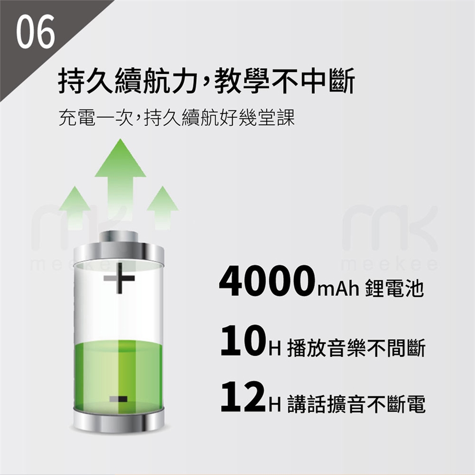 使用時間:8~12小時(擴音模式);6~10小時(音樂模式)