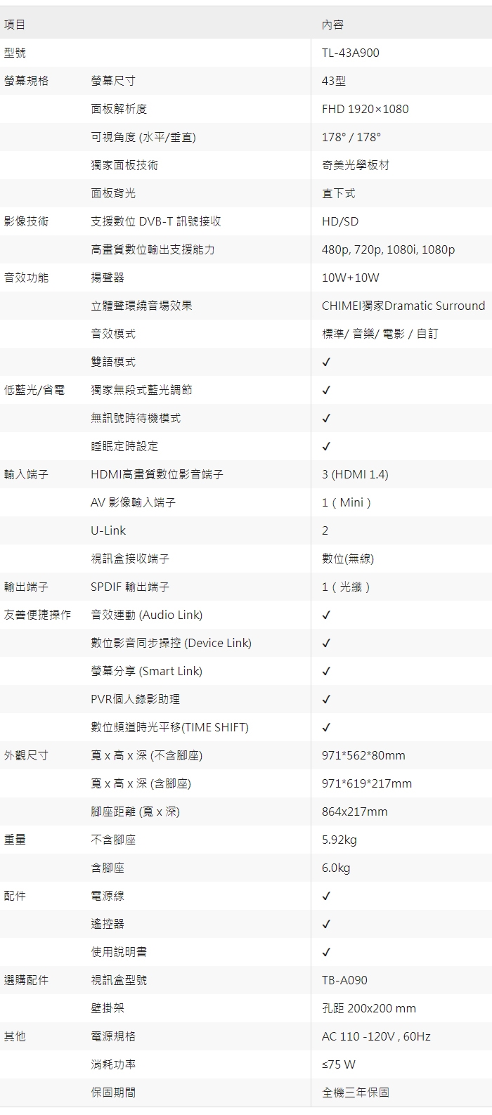 CHIMEI奇美 43吋FHD低藍光液晶顯示器+視訊盒(TL-43A900)
