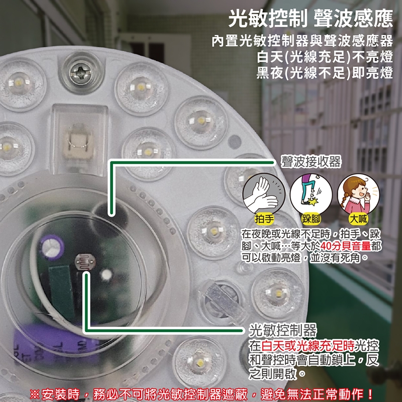 - 本產品由聲控+光控組合控制設計,雙重感應組合為生活環境更節電。
