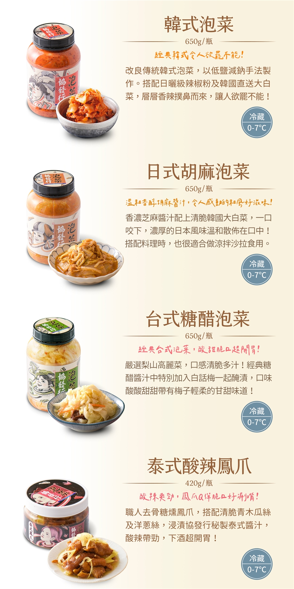 可以冷食當小菜、拌飯拌麵、煮湯煮火鍋等多種料理,除了可以直接當作開胃菜以外,泡菜更可以煮韓國泡菜鍋、泡菜炒豬肉(牛肉)、還可以搭配涼麵變成美味涼麵、多種吃法,超級方便 !