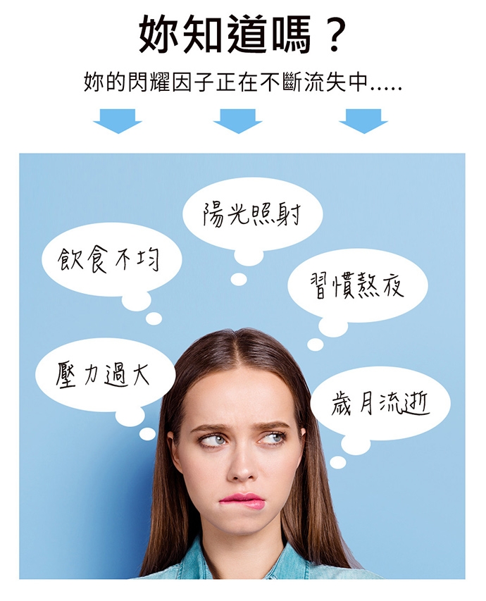 豔陽高照、忙碌壓力大、加班熬夜、營養不均、煙不離手…等,環境中無所不在的壞因子,讓你縱使保養品塗再多也依舊美麗破功,滄桑痕跡顯著!