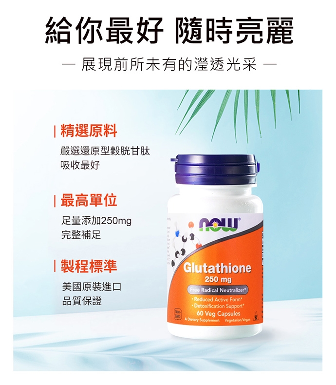 榖胱甘肽分為還原型(GSH)與氧化型(GSSG),體內主要以還原型式的GSH去調節運作,購買時不要只比較價錢,請記得選擇還原型榖胱甘肽才能達到健康亮采!