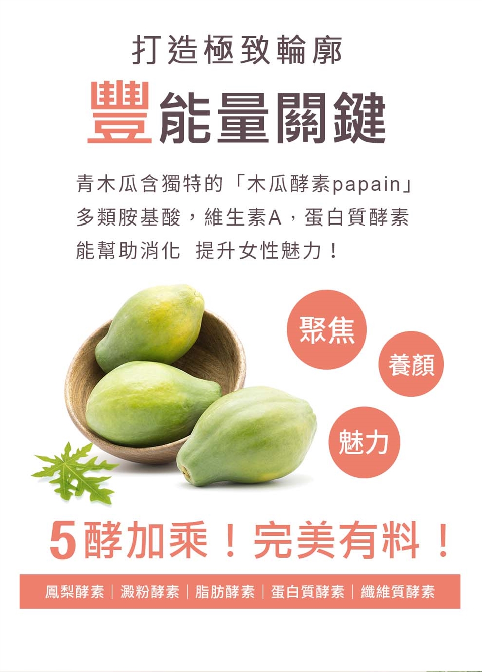 未成熟的青木瓜含有相當豐富的酵素,除了可幫助消化外,亦能滋補營養、調整體質,對女性健康有很大的益處。本產品複合了木瓜酵素與青木瓜精華,雙效加強調節,讓妳在邁向女人的過程更增添自信與魅力!