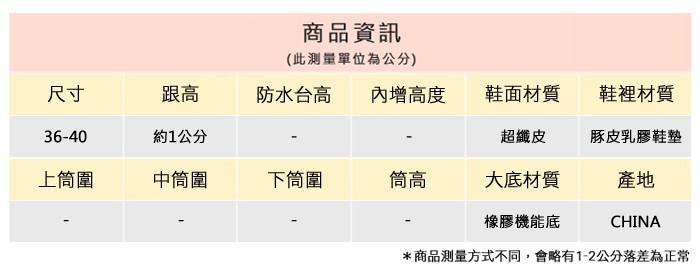 2.鞋類商品依功能及用途之不同,鞋底各有其止滑係數之個別不同,使用鞋類商品請用於正常平坦之路面,非雨鞋或雨靴類商品,請避免穿著於下雨濕滑路面上行走。