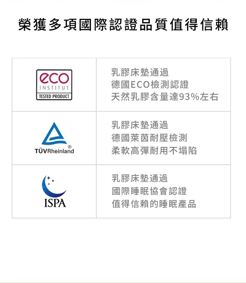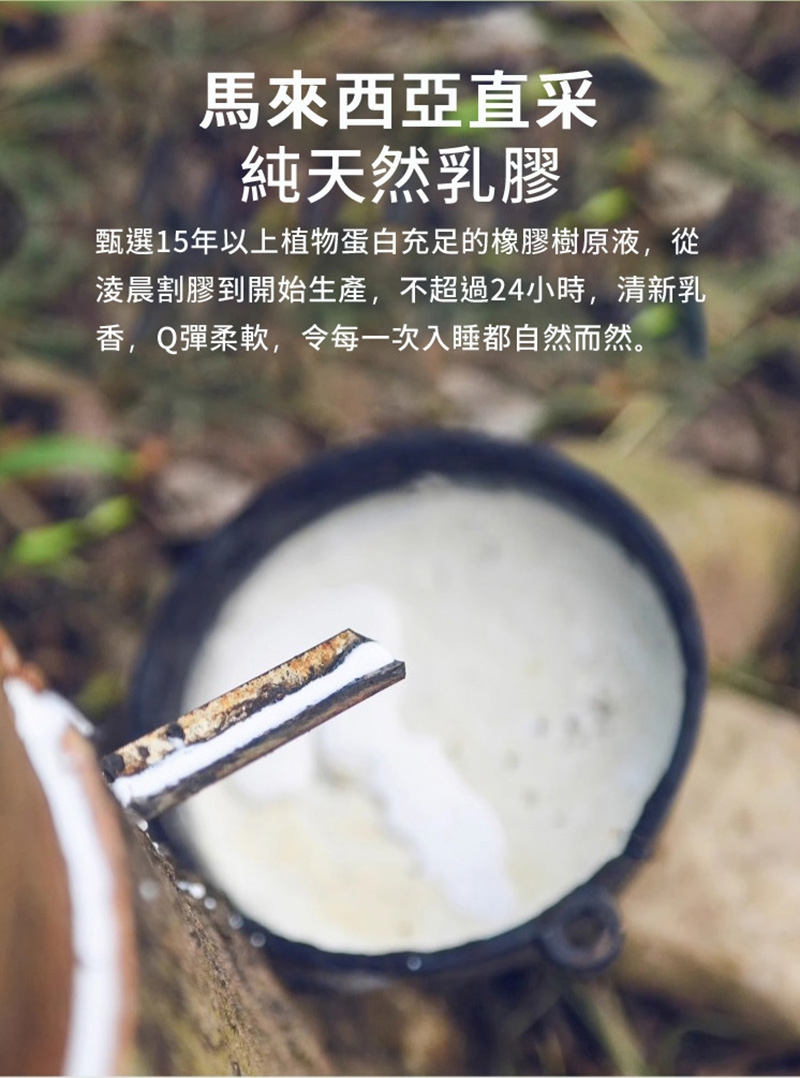 選用馬來西亞乳膠,天然健康且帶有一股乳香味,可自然分解對環境無害。