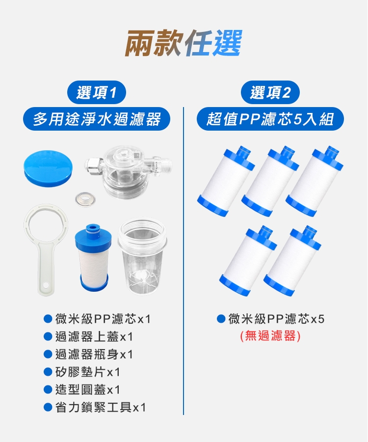 包裝內容物:多用途前置淨水過濾器x1、PP濾芯x1