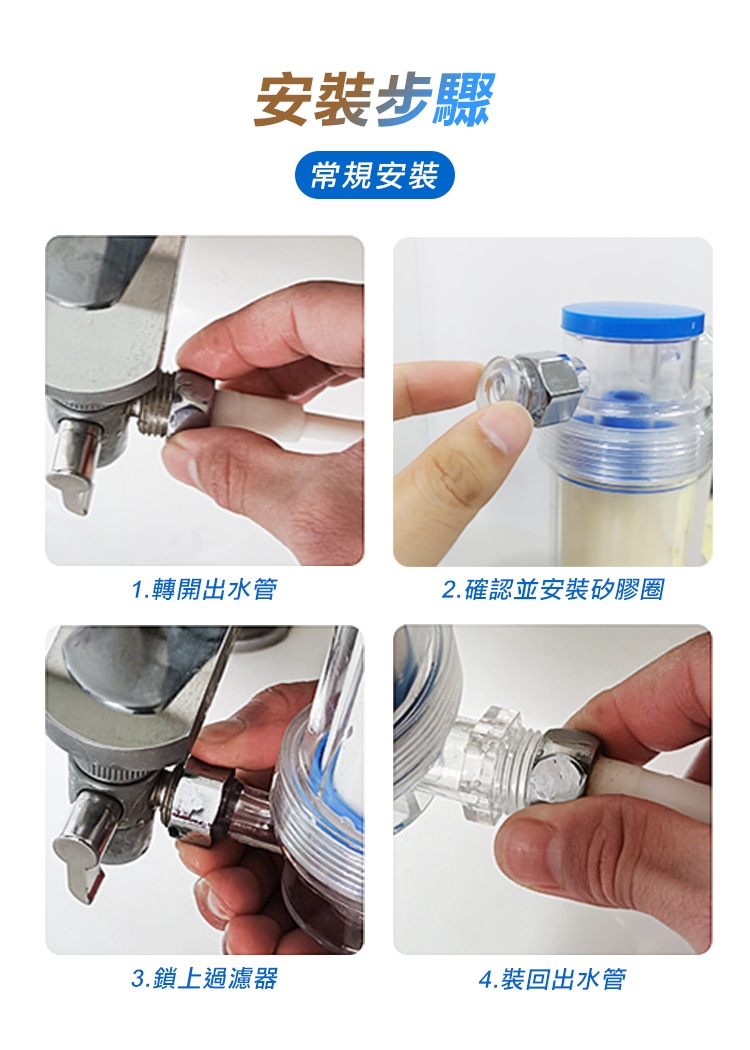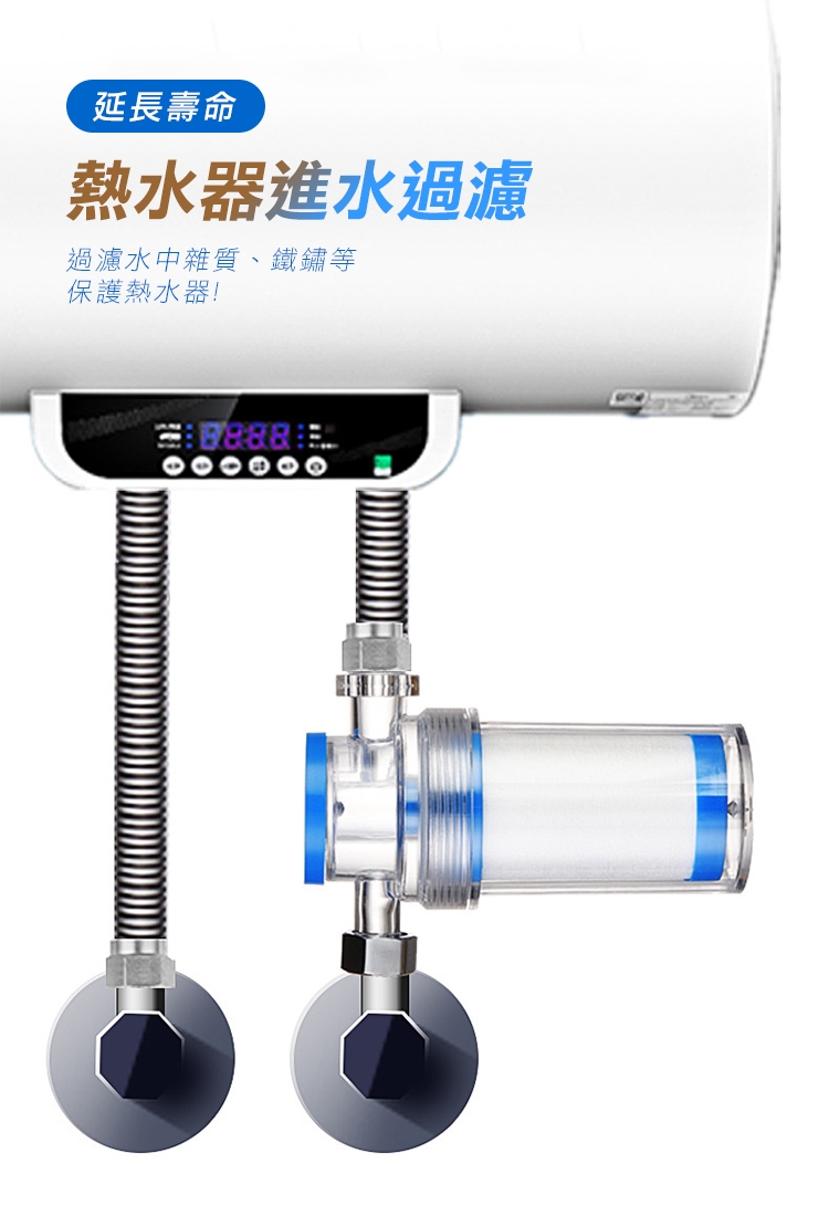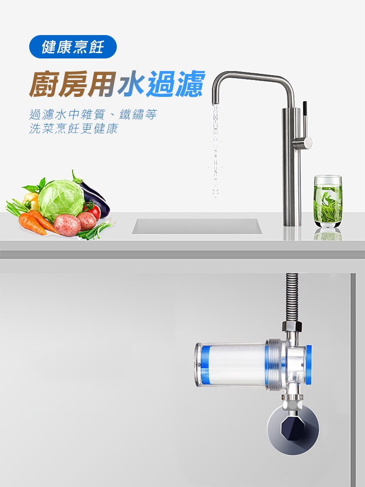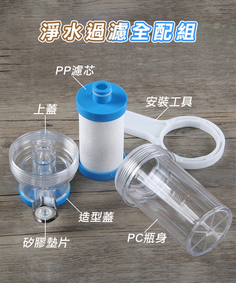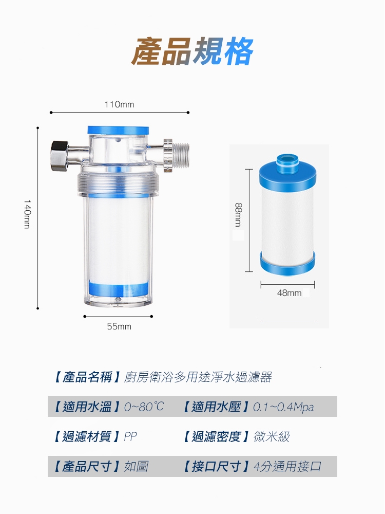 水是日常生活中不可或缺的必備民生必需品,家中管道難以清潔或是更換,日常生活中不只飲用水要過濾,清洗蔬果及沐浴時接觸到污染的水也會刺激敏感肌膚導致泛紅,發癢!高效能5微米超細PP棉濾芯,有效過濾自來水汙染礦物,還能阻擋含量過高餘氯(消毒水)。食品級可透視PC材質,隨時了解水質狀態,即時更換濾芯。多用途,前置過濾廚房、衛浴、熱水器、洗衣機、蓮蓬頭皆適用!通用純銅4分接頭,抗腐蝕、老化,安裝便利!呵護您的健康,家中水質靠它把關!