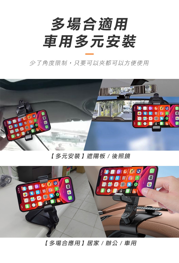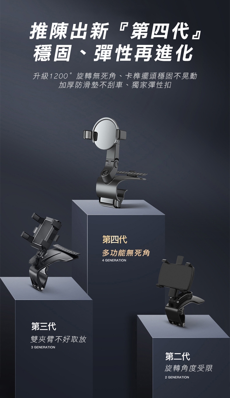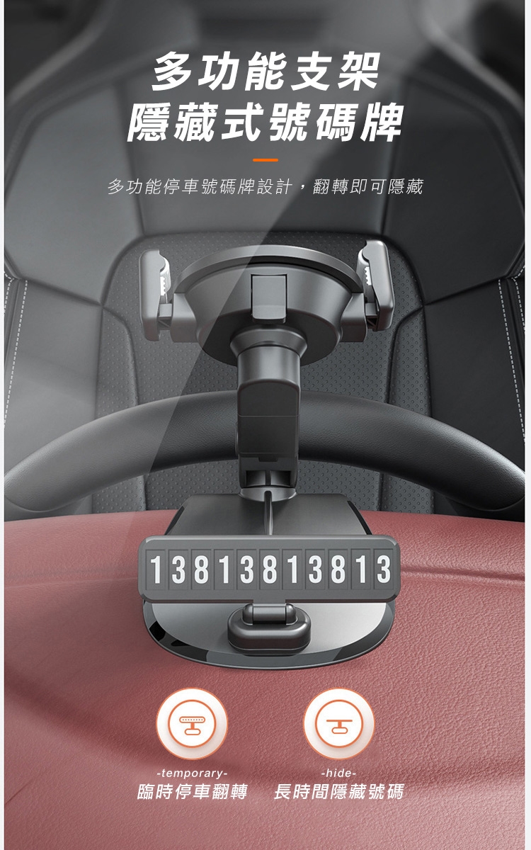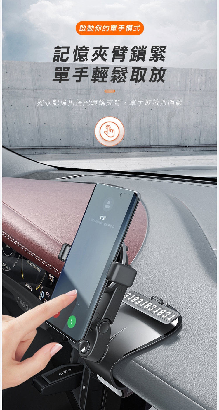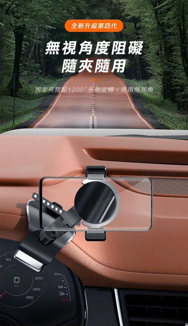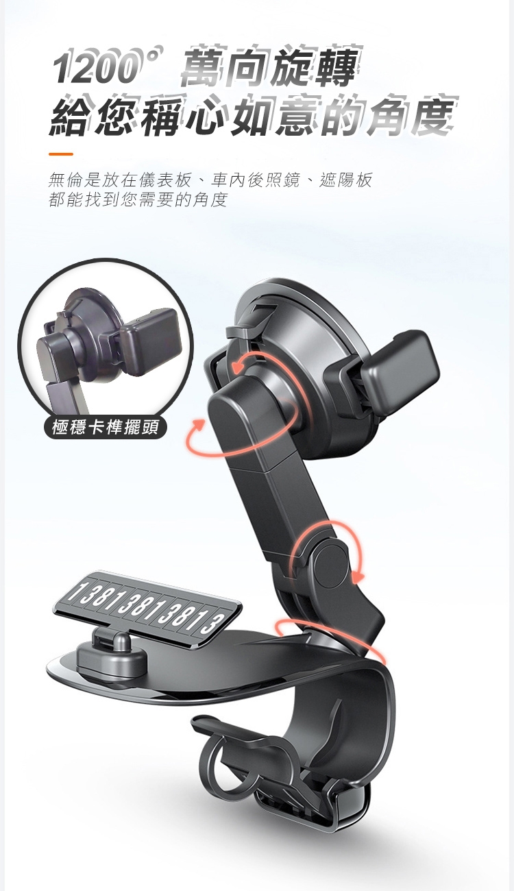 全新升級第四代多功能車用手機架 1200°萬象無死角!可安裝於儀表板、後視鏡、遮陽板,依照不同需求調整最適合的角度,行車出遊更安全!獨創可伸縮記憶夾臂,單手取放無阻礙! 多功能隱藏號碼牌設計,翻轉即可快速隱藏!讓您行車安全又便利~