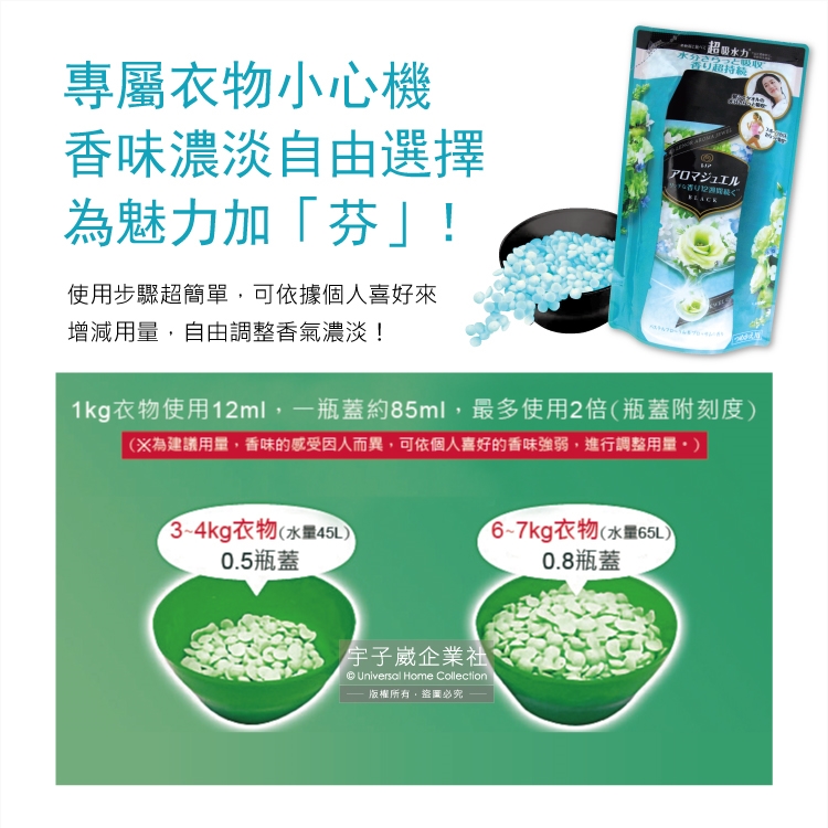 (9)持久芳香效果會受當次洗滌衣物多寡、水量、衣物翻轉次數、洗衣機類型、晾曬方式和靜置狀態等因素不同而影響香味持久時間。