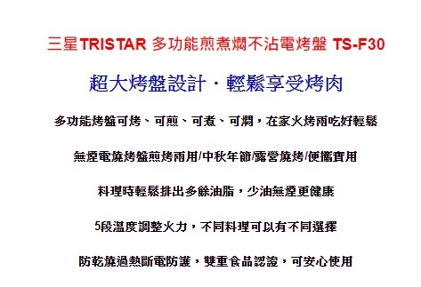 ◎品名:三星TRISTAR 多功能煎煮燜不沾電烤盤 TS-F30