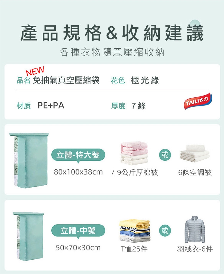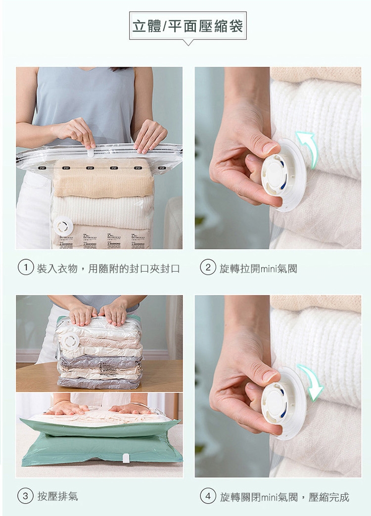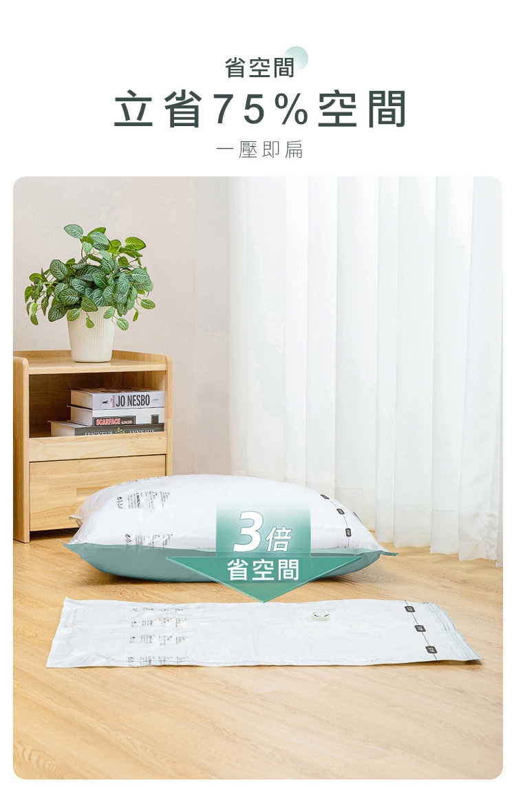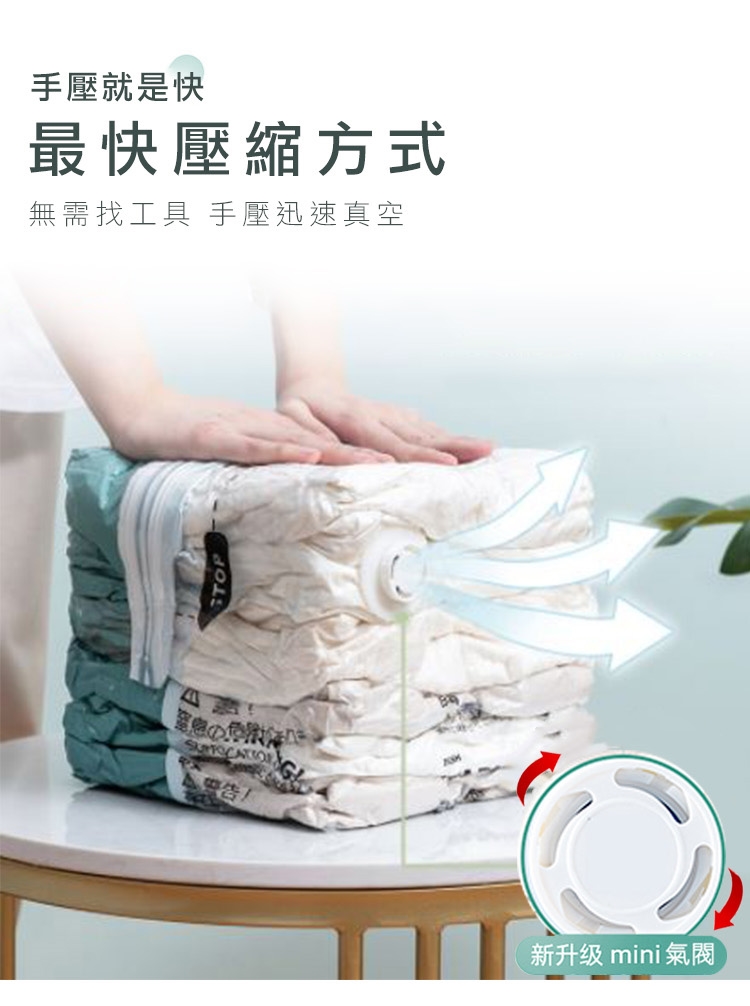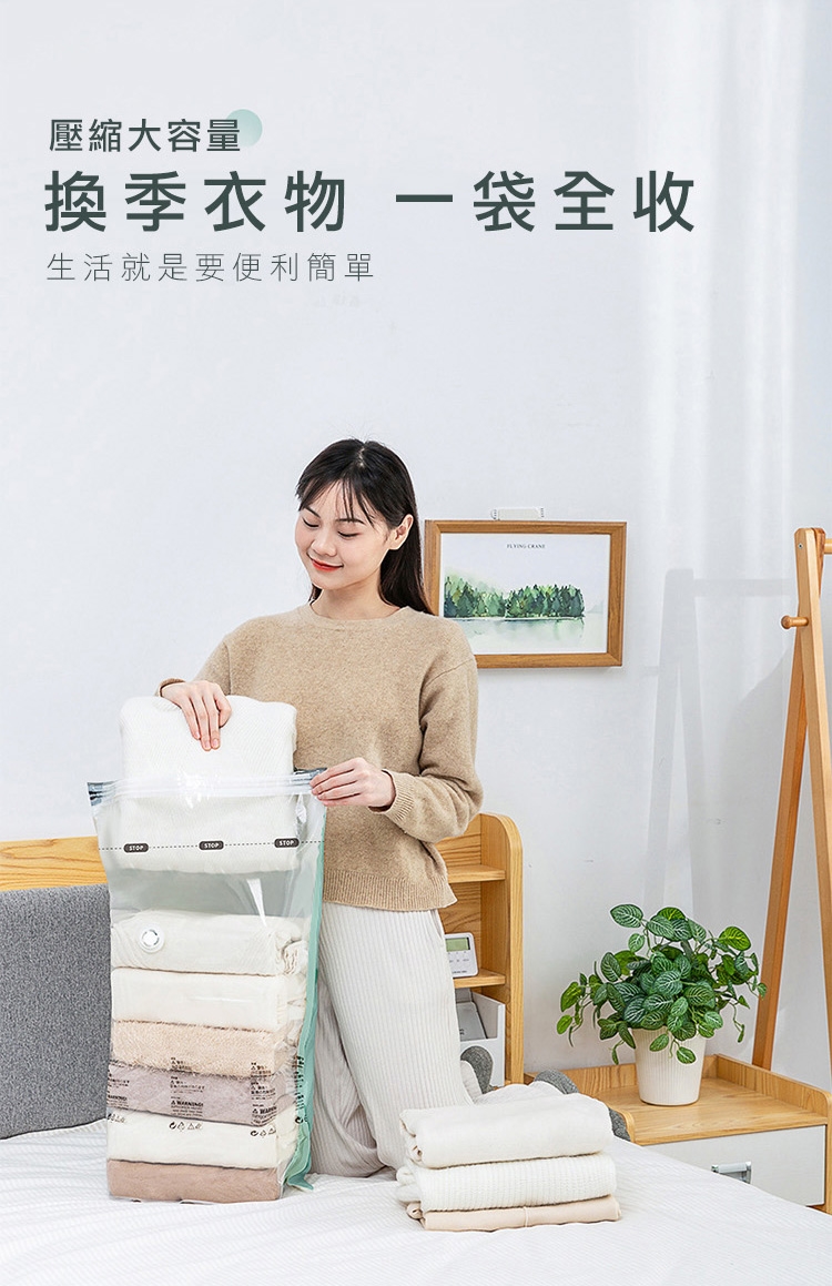 還在煩惱換季衣物怎麼收納嗎? 快試試 新升級免抽氣立體真空壓縮收納袋! 告別各式抽氣工具!8秒快速完成真空。超強韌性,可重複使用,裝載40kg也不易破損。 內附順拉封口夾,封口更便利。新創封口顯色設計,再也不怕沒密封完整漏氣的困擾。六種尺寸可依需各種需求做挑選。輕鬆節省衣櫃75%以上空間,是換季收納的好幫手唷~