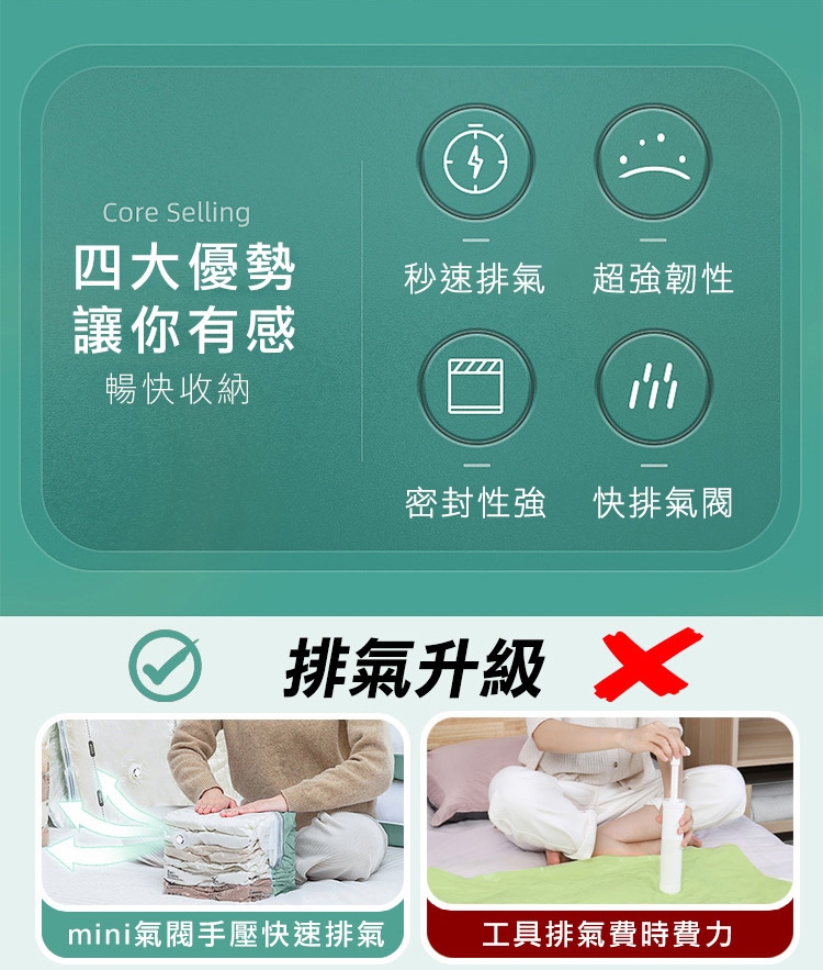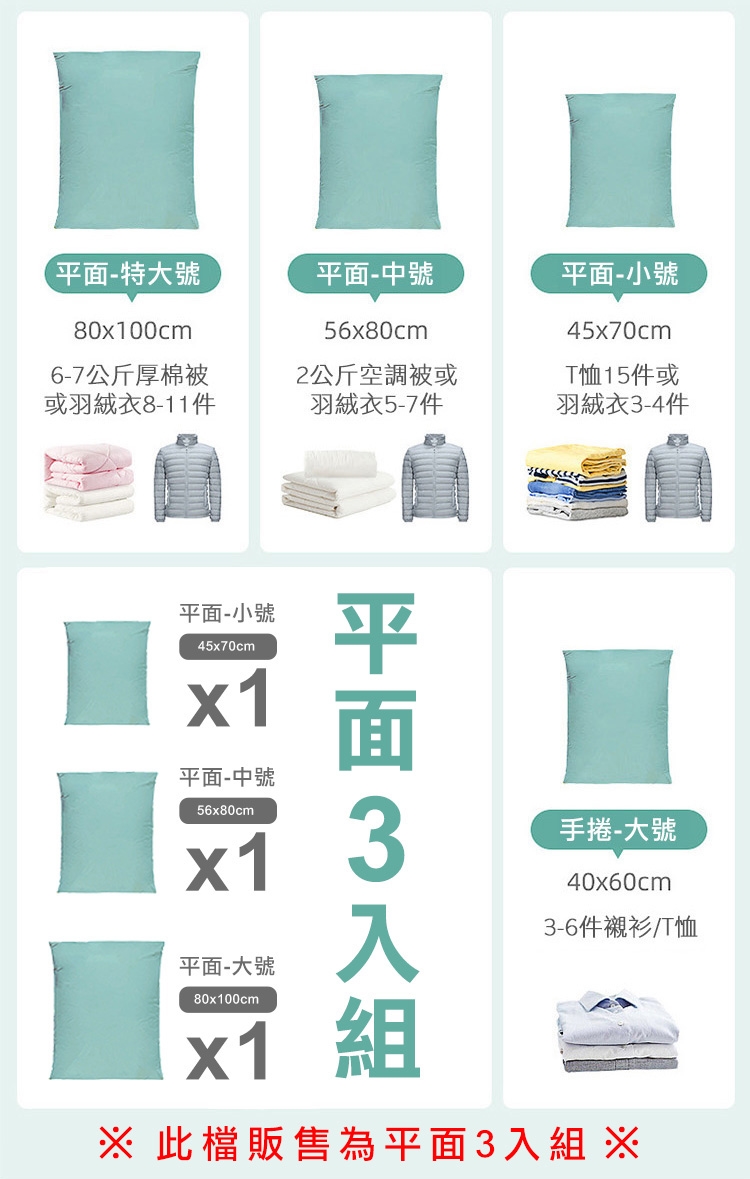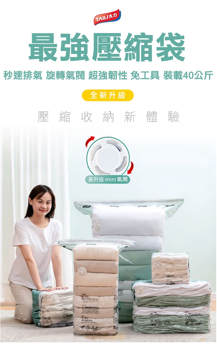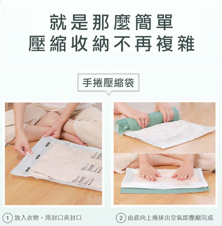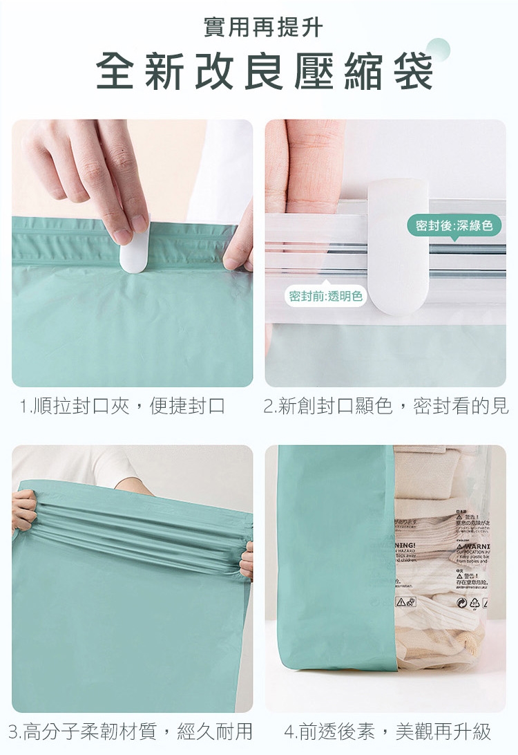 還在煩惱換季衣物怎麼收納嗎? 快試試 新升級免抽氣立體真空壓縮收納袋! 告別各式抽氣工具!8秒快速完成真空。超強韌性,可重複使用,裝載40kg也不易破損。 內附順拉封口夾,封口更便利。新創封口顯色設計,再也不怕沒密封完整漏氣的困擾。六種尺寸可依需各種需求做挑選。輕鬆節省衣櫃75%以上空間,是換季收納的好幫手唷~