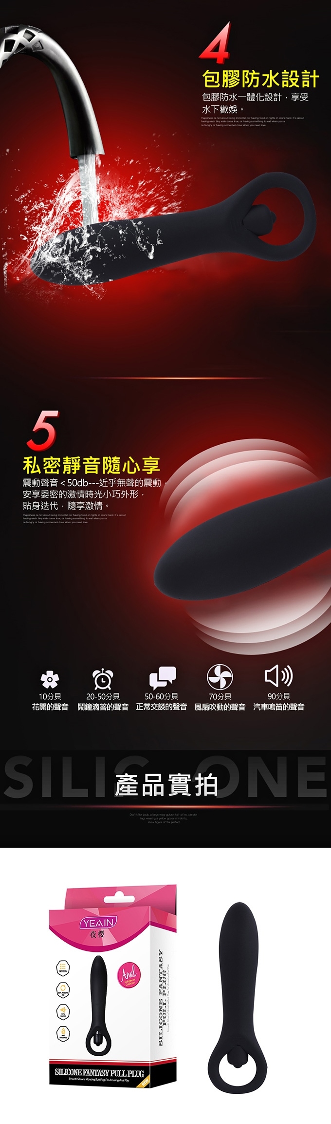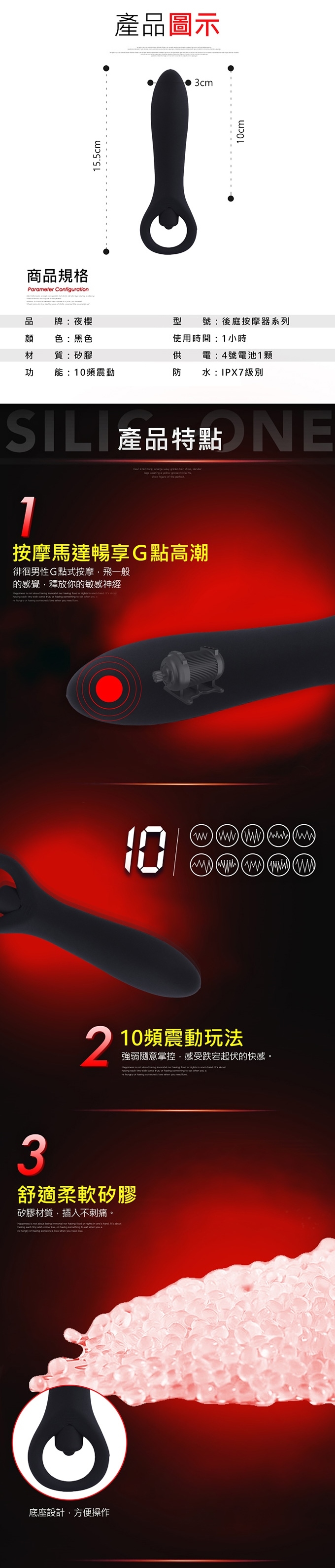 流線型設計,柔軟細膩,覆蓋你後庭的敏感區域!產品造型容易確定G點所在,滑入自動定位。多種震動模式,不同模式滿足不同人群敏感度。全方位防水,水下盡情享受歡愉。矽膠材質、舒適造型及尺寸善待你的柔嫩肌膚!這一次,不同造型刷新你的高潮感觀,讓你感受源自後庭G點不一樣的快感。