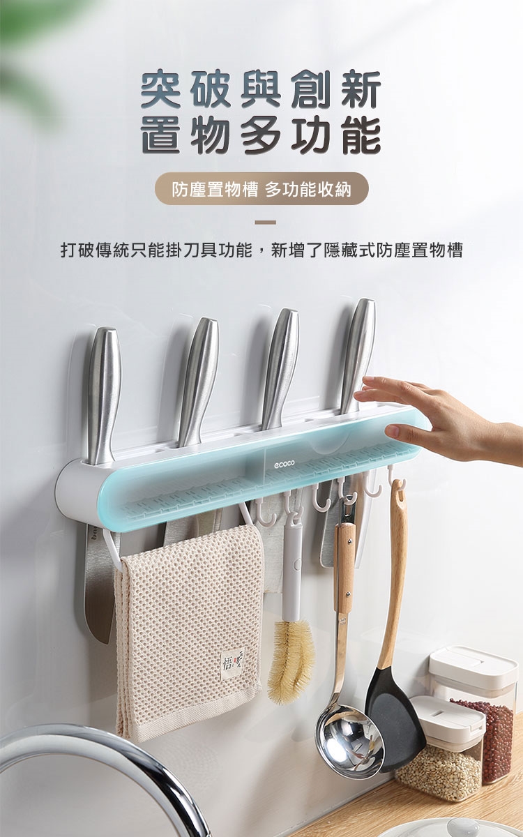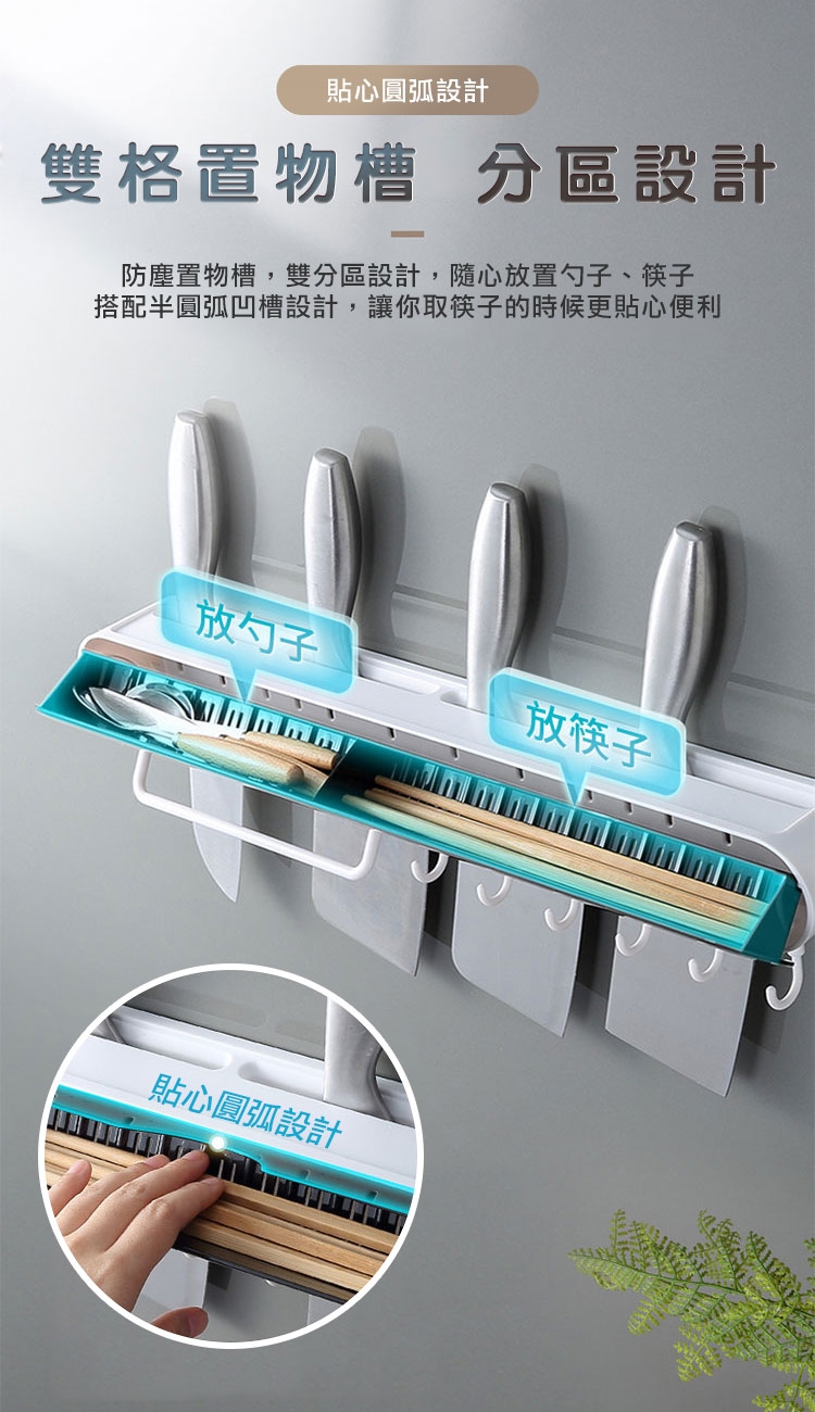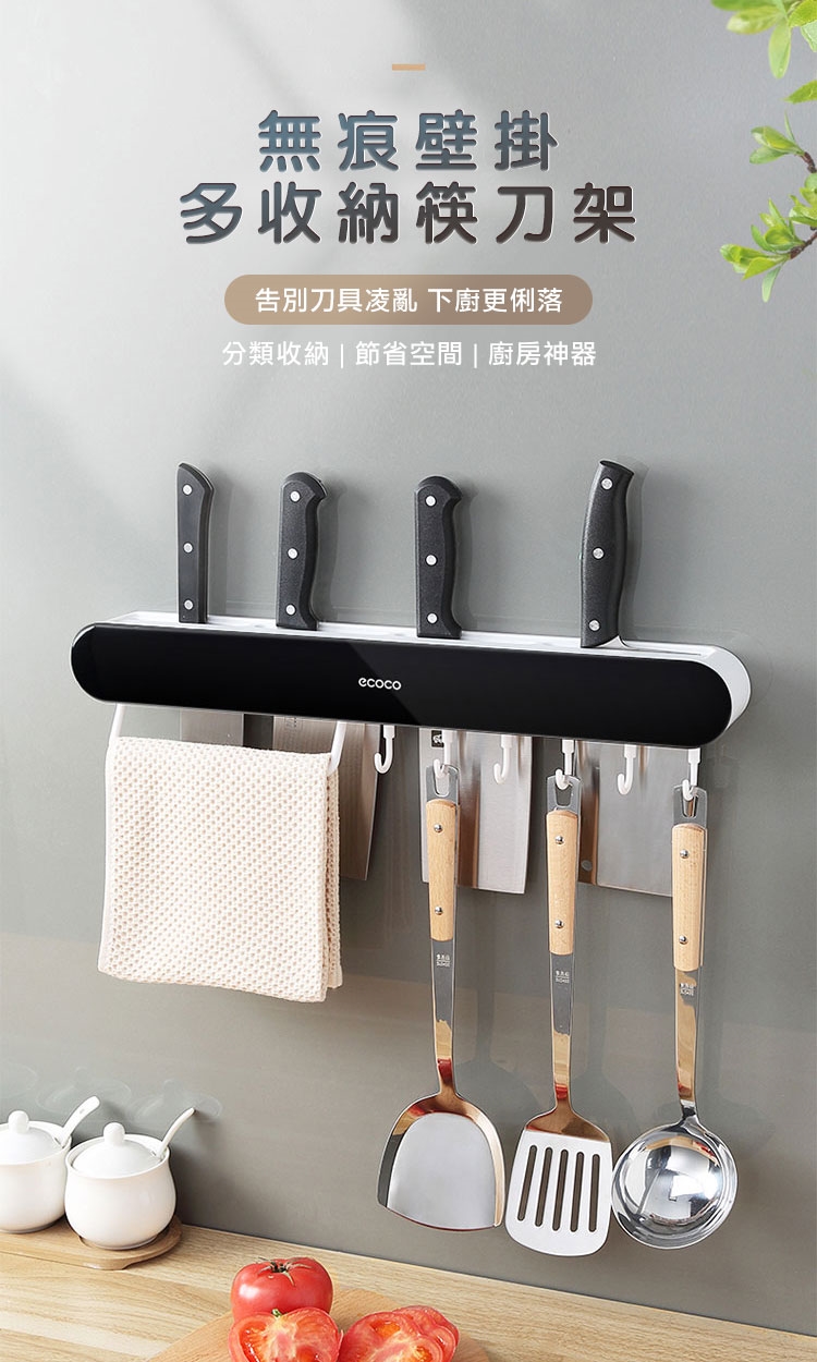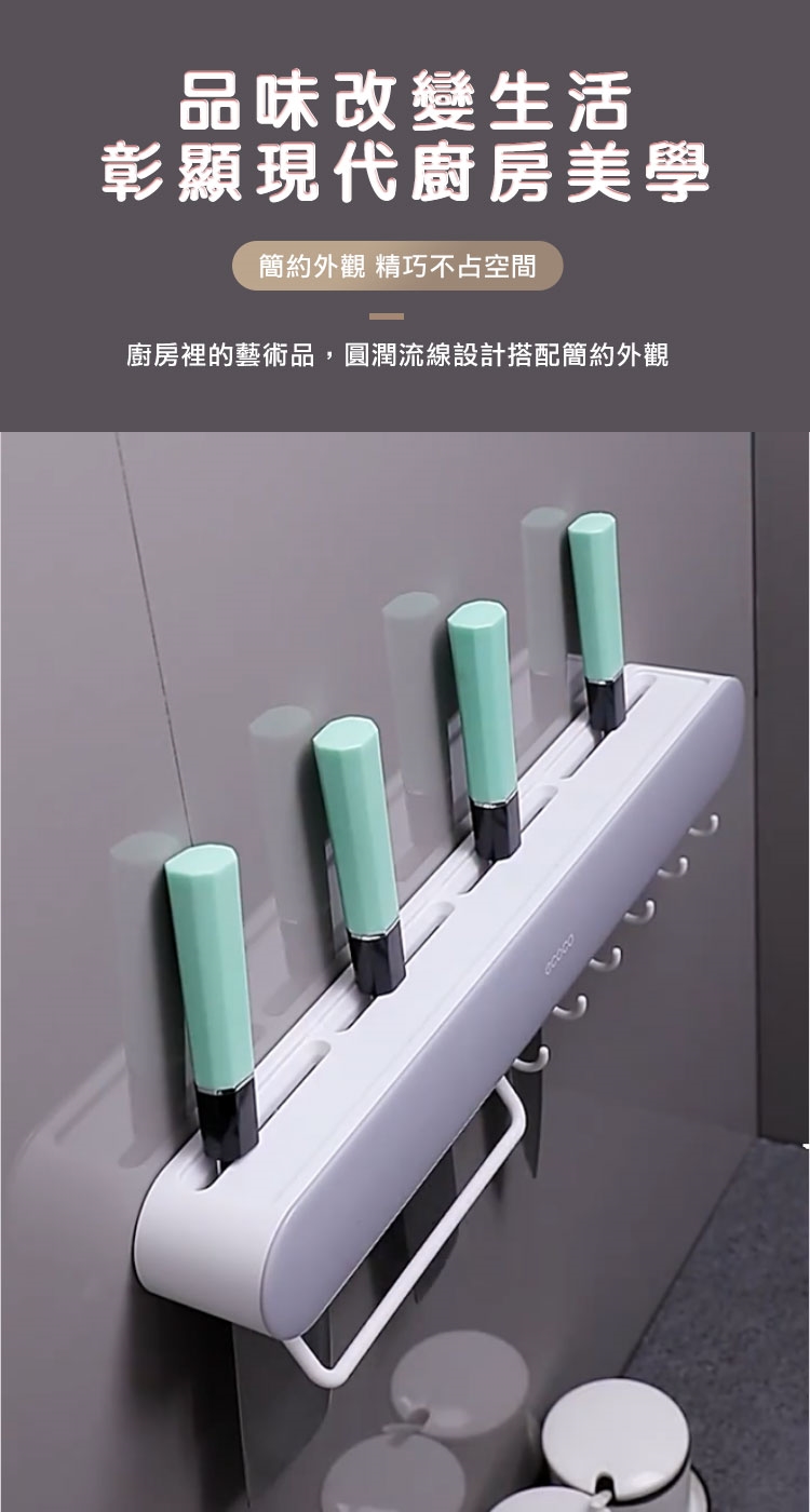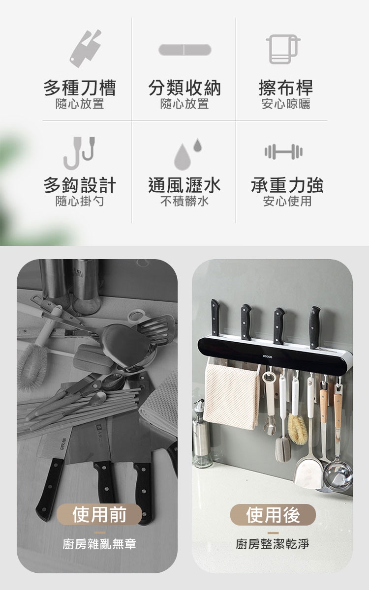 豪華新升級!新款無痕壁掛多收納筷刀架,加長尺寸四位刀架,便利擦布桿,活動6掛勾,新創雙格防塵置物槽,可收納瀝水筷子湯匙,便利再升級,免釘鑽防水耐重無痕貼,快速便利安裝,廚房必備的好商品~