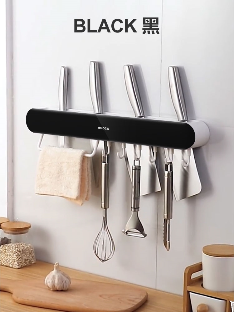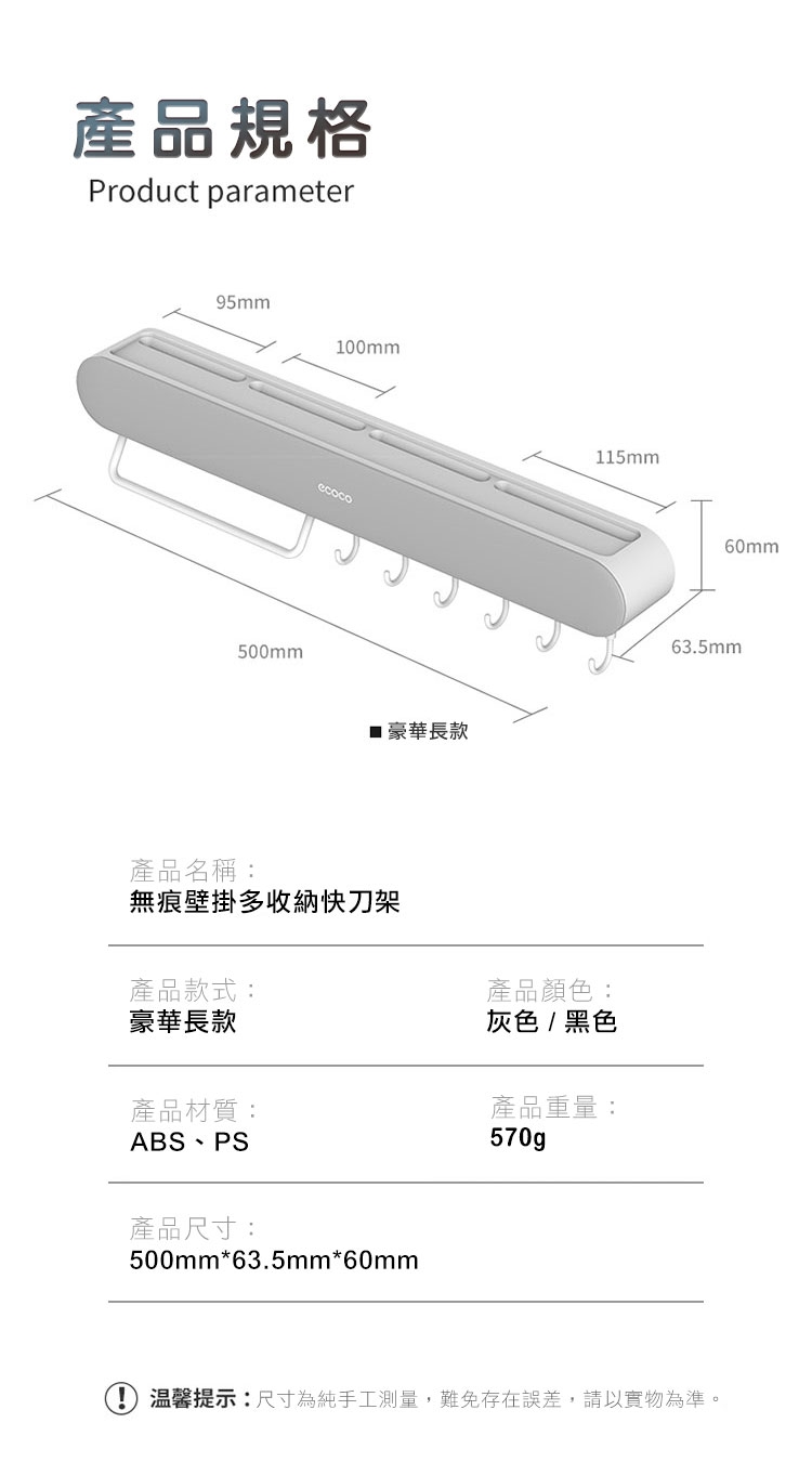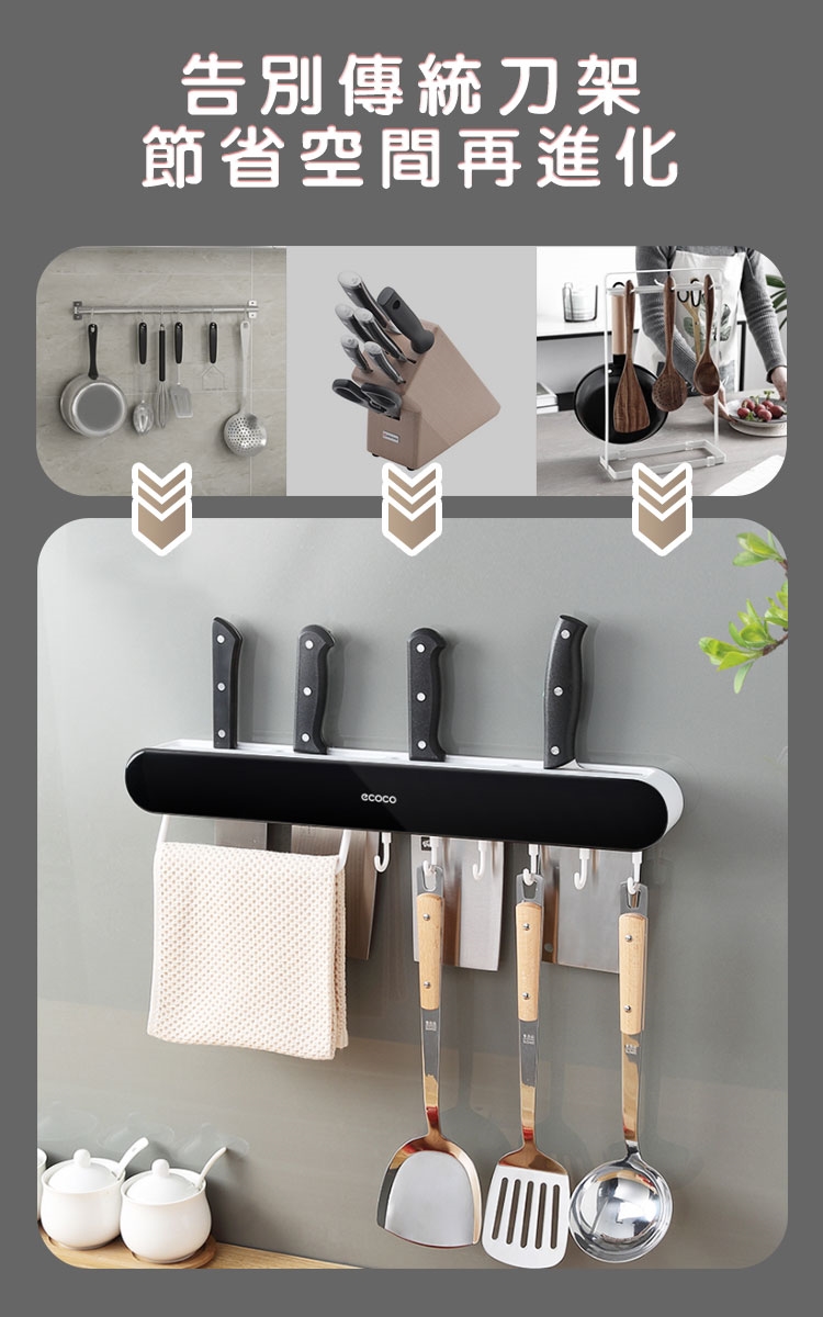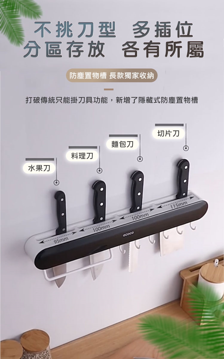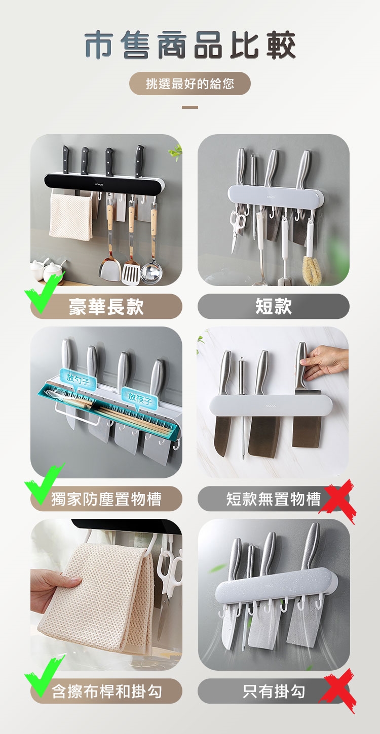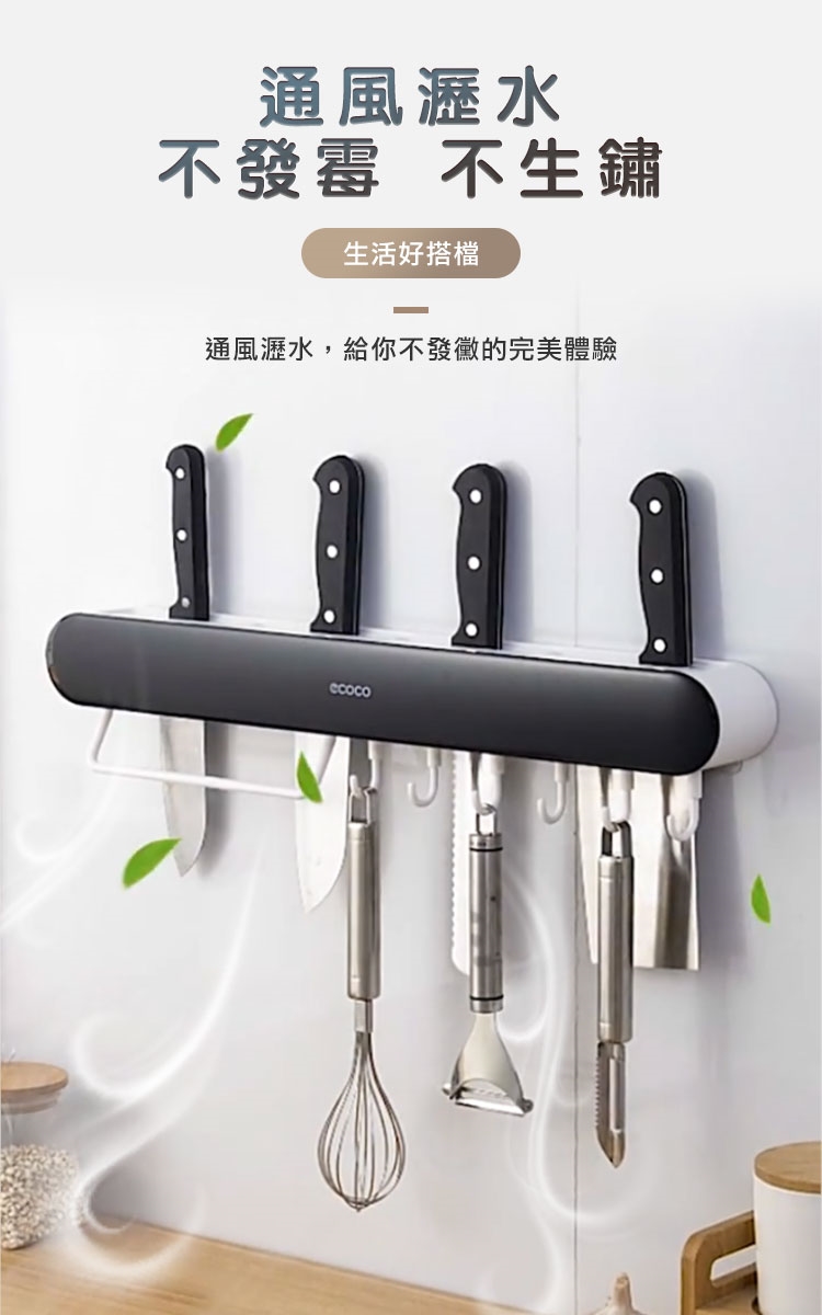 豪華新升級!新款無痕壁掛多收納筷刀架,加長尺寸四位刀架,便利擦布桿,活動6掛勾,新創雙格防塵置物槽,可收納瀝水筷子湯匙,便利再升級,免釘鑽防水耐重無痕貼,快速便利安裝,廚房必備的好商品~