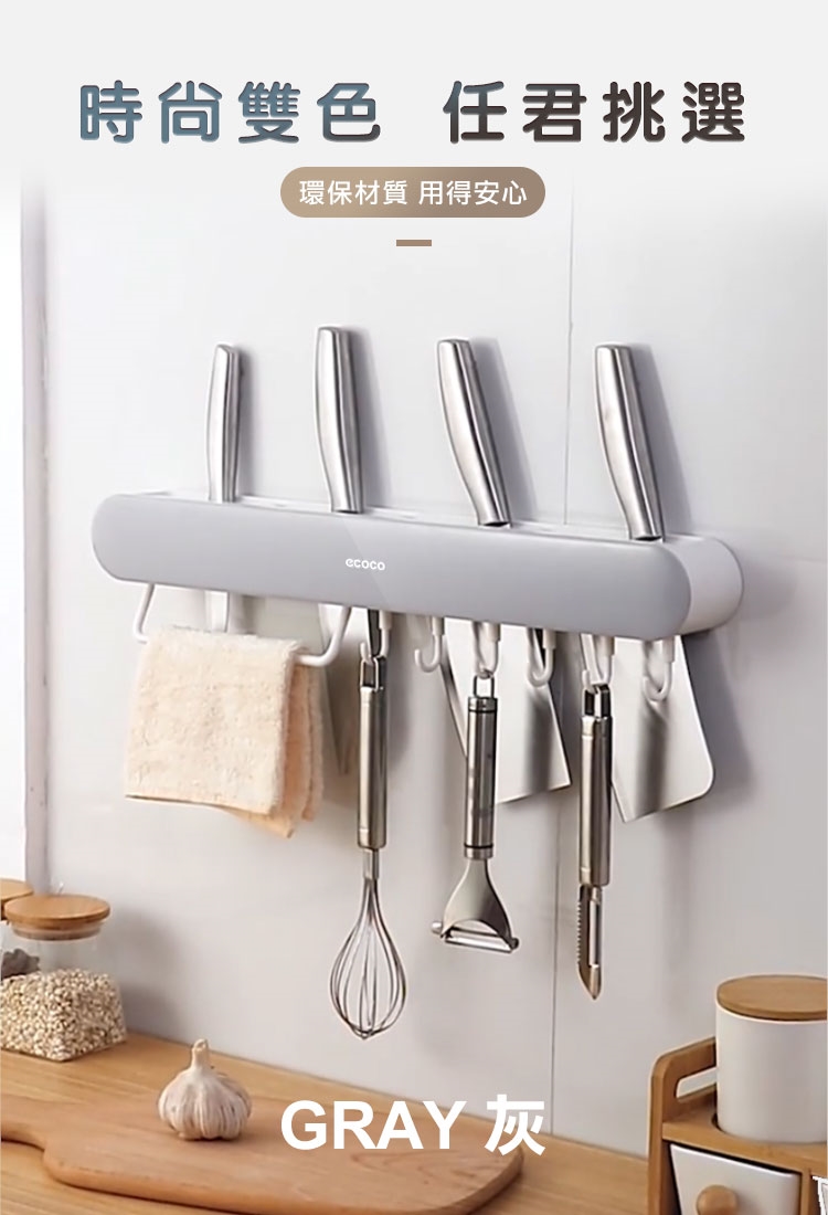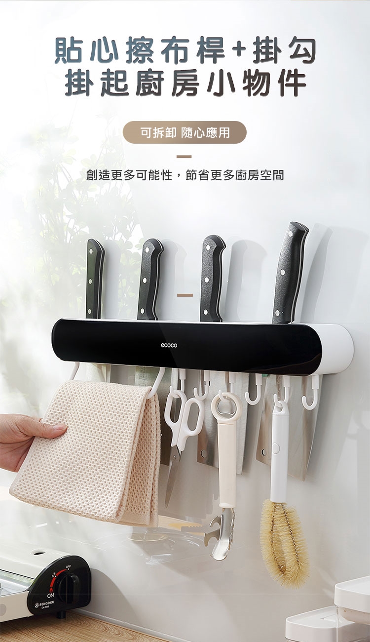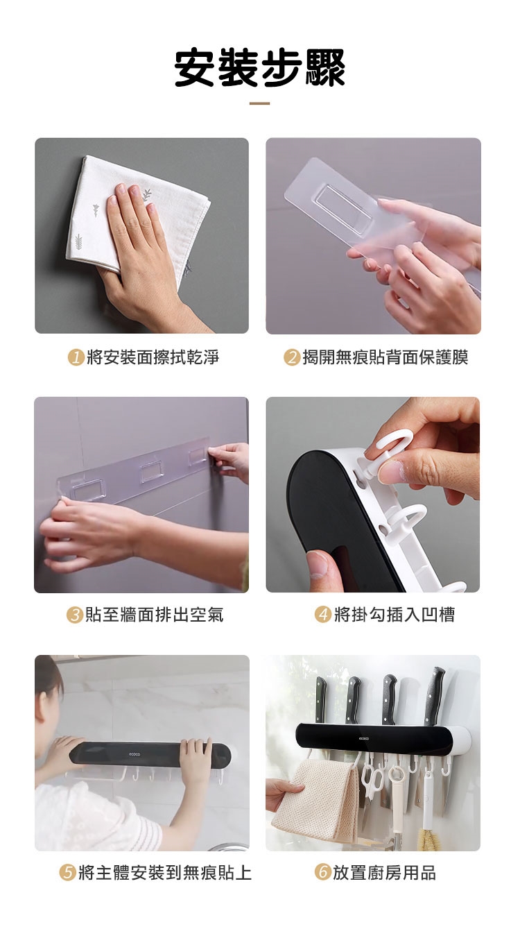 內容物:收納筷刀架x1/防水耐重無痕貼片x1/擦布掛架x1/活動掛勾x6