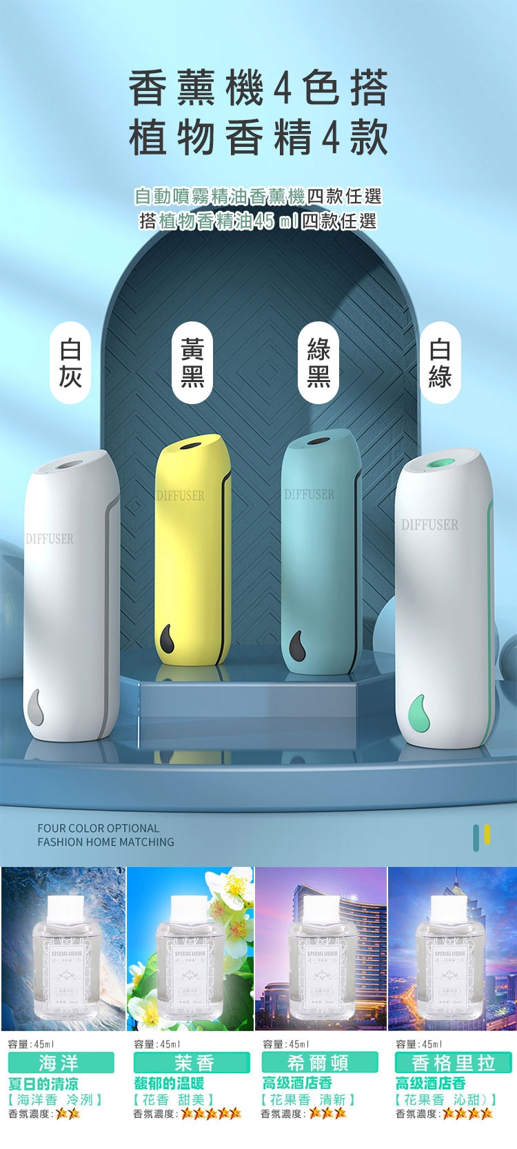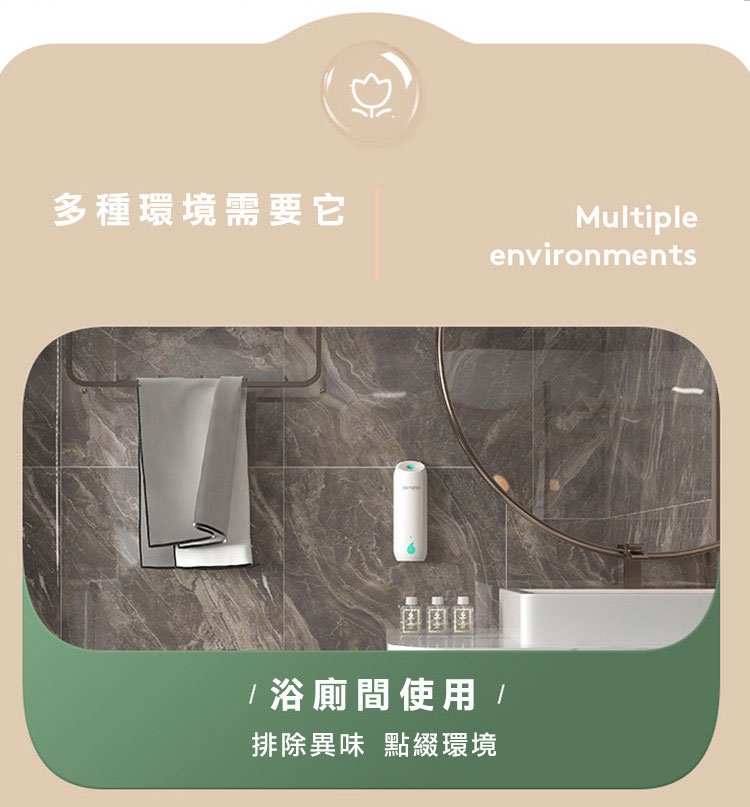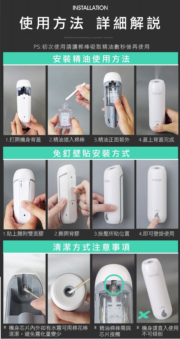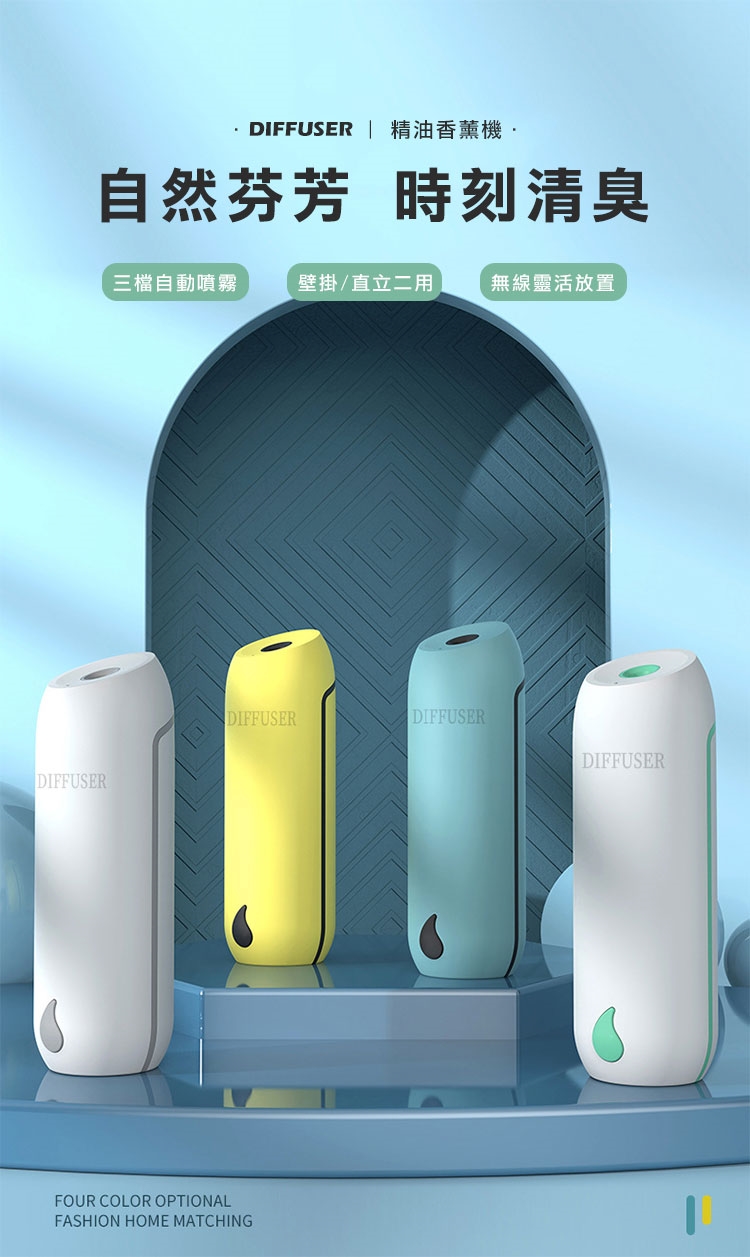 您是否為了保持居家、衛浴持久香氛,買了許多的芳香小物呢?市售的擴香瓶因無法控量,揮發快速。香氛蠟燭需點火,使用危險。快來試試新款的二用自動噴霧精油香薰機,免插電、免鑽釘無痕安裝、壁掛/直立擺放皆可使用!三種噴霧模式 可自由調節。香味可覆蓋50平方公尺,讓您的居家處處留香。四種清新香味任君挑選!讓您的生活充滿幸福香味~