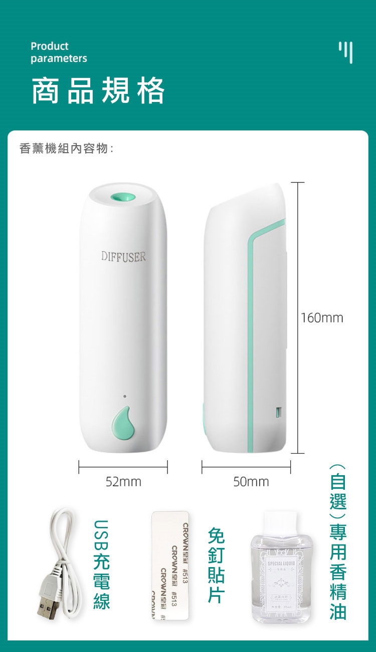 內容物:自動噴霧機x1/充電線x1/免釘貼片x1/專用植物精油x1