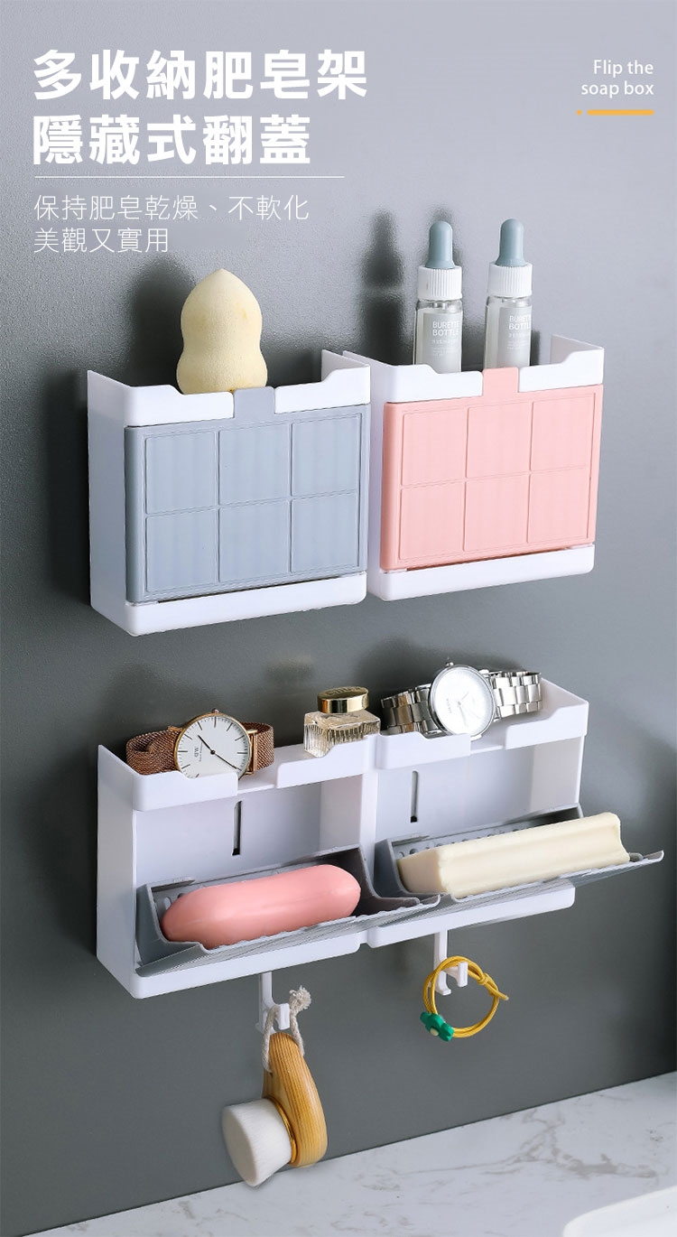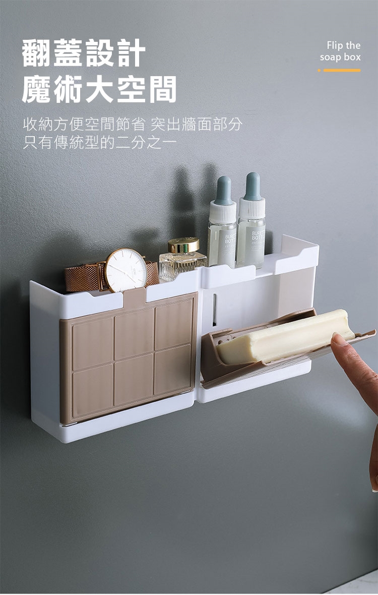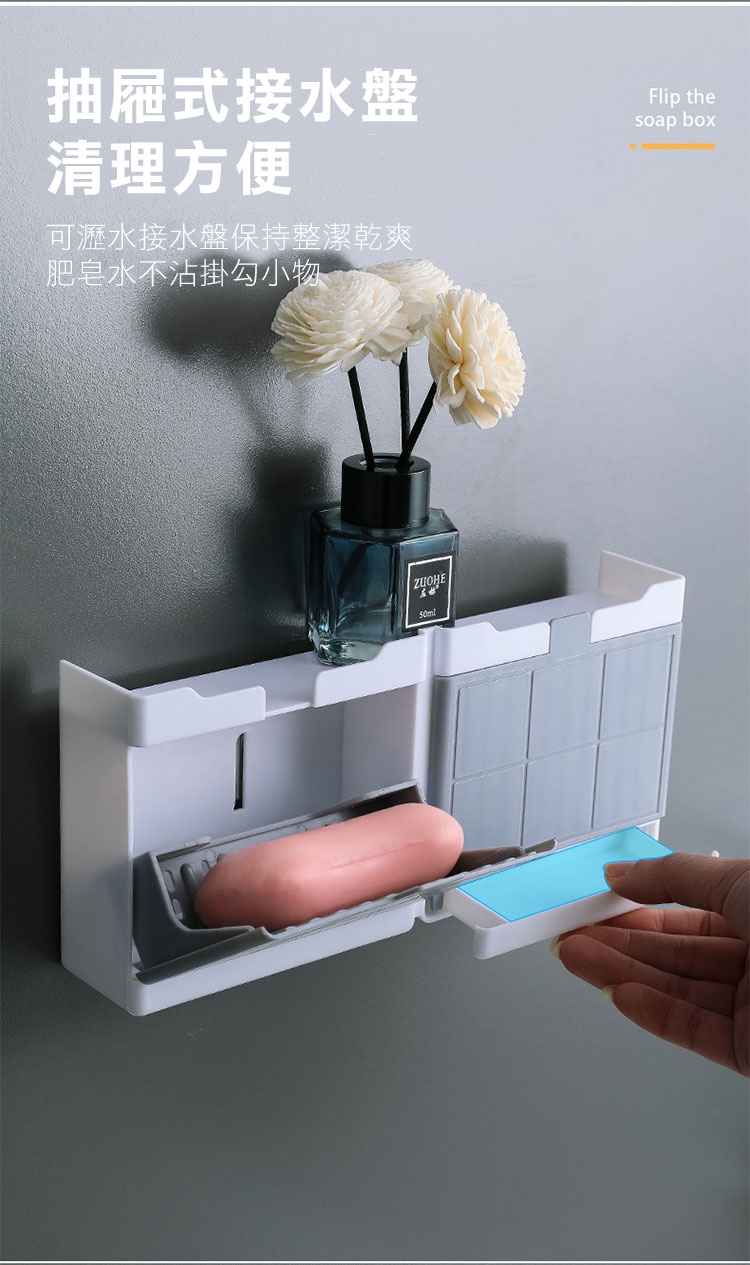 使用肥皂最怕的就是沒有一個適合的容器,來試試這款,多收納不滴漏隱藏肥皂架,免鑽釘 無痕安裝,翻蓋設計 魔術大空間,收納方便 節省空間,頂部小檯面,可隨心放置手錶、手機、飾品等等隨身小物。抽屜式接水盤,便利清潔。內附可拆卸式掛勾 可懸掛多種小物件。多用途設計,值得高品味的您擁有~!