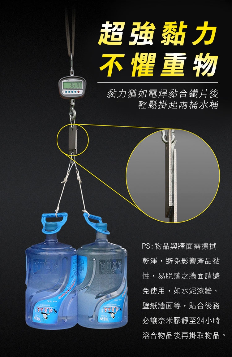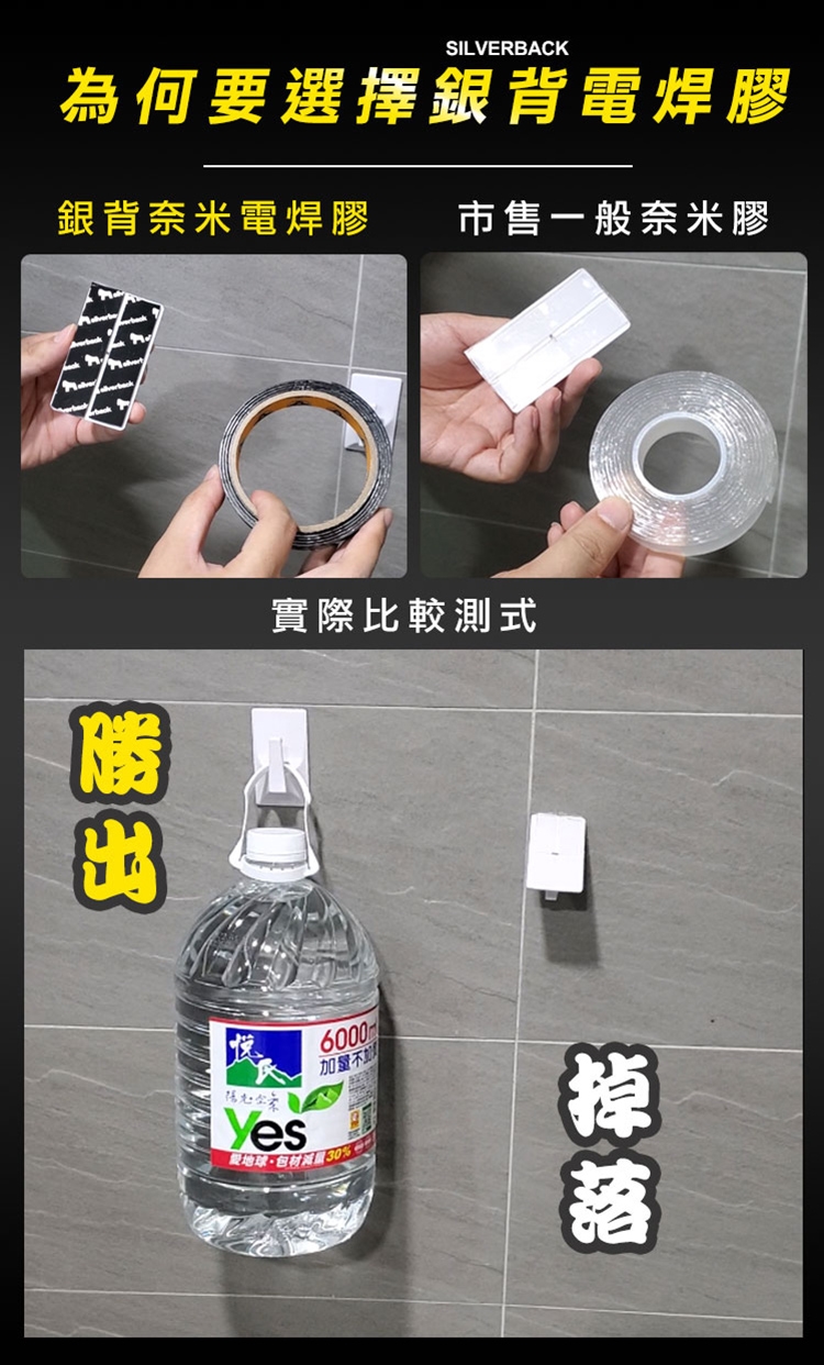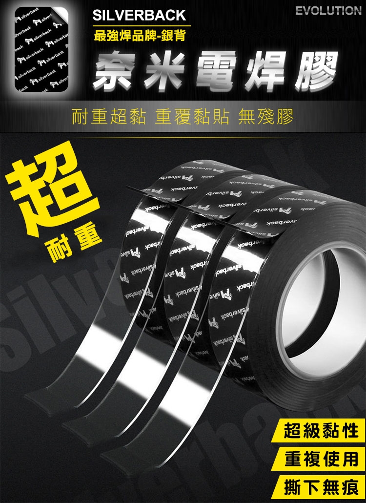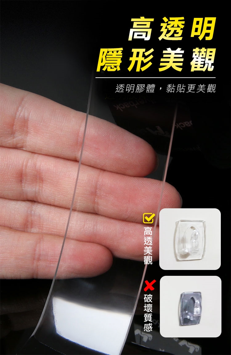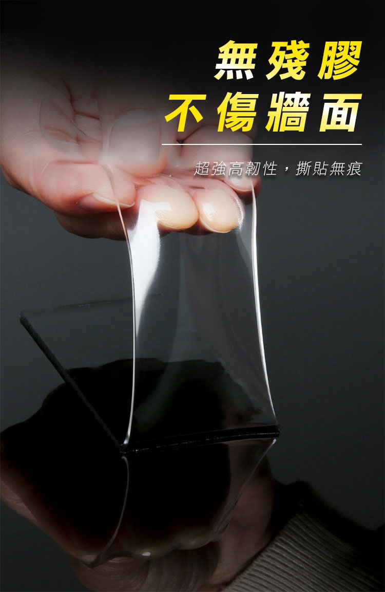 有了超耐重無痕防水奈米電焊膠,再也不用鑽釘打孔安裝物品了!超強黏力 用雙面膠代替電鑽電焊,免釘鑽、超耐重、防水防潮、高透明、撕下無痕不殘膠,安裝便利快速。可水洗,晾乾後可重複使用。現在只需把家中物品(收納架等)貼上奈米電焊膠,一樣可立馬搖身一變,變成超耐重防水無痕收納架。輕輕鬆鬆讓家中變成超實用無痕便利屋吧!