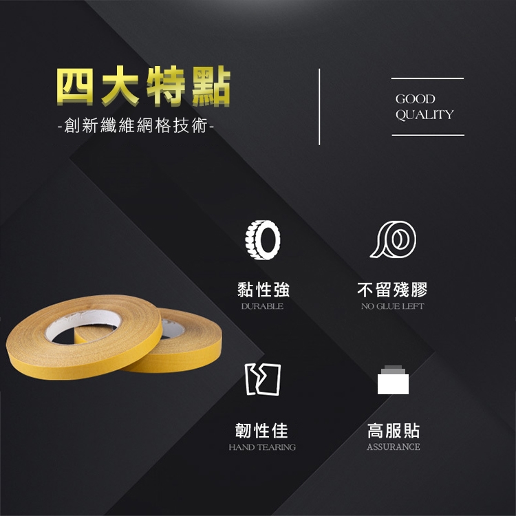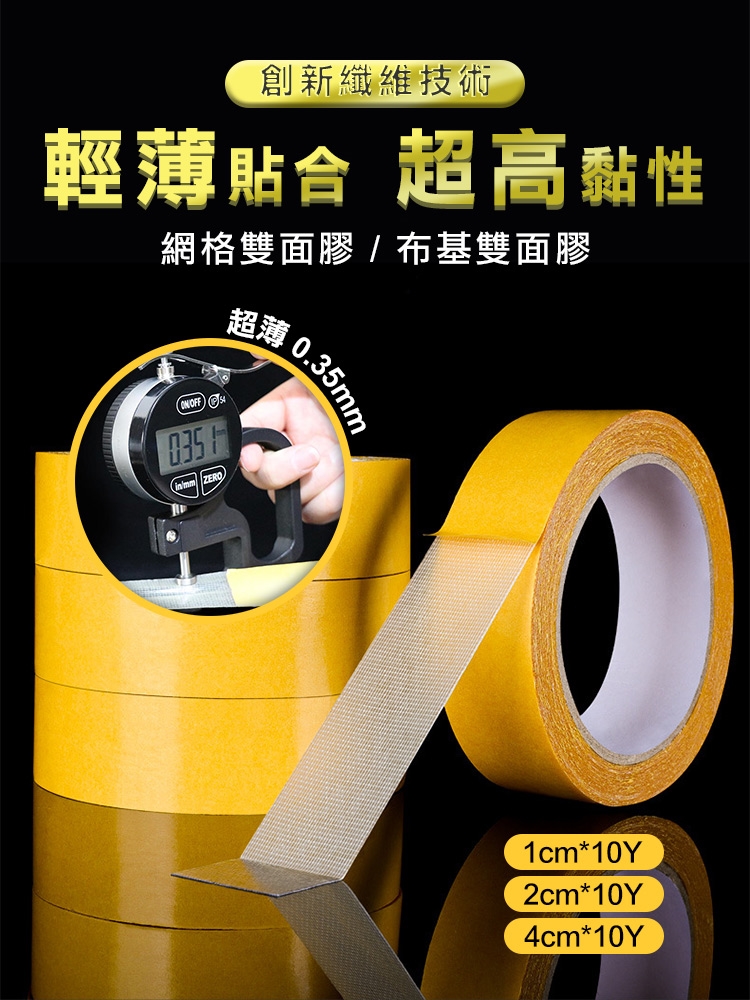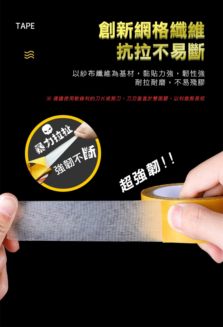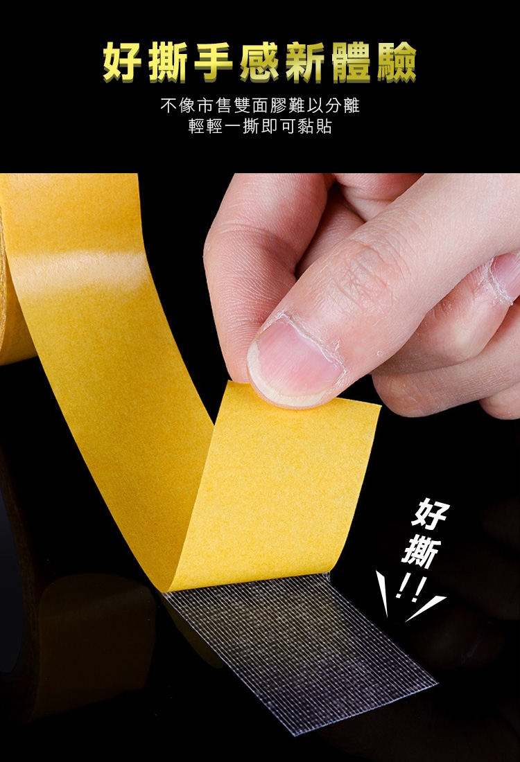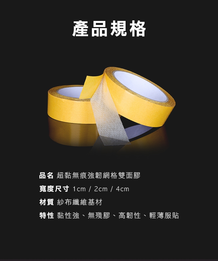 創新強韌網格雙面膠,有別於傳統泡棉膠跟雙面膠,新升級紗布纖維,韌性佳,用力撕扯也不斷,採用最新網格纖維科技,輕薄貼合也不失黏性。黏性強,撕下無痕 乾淨不留殘膠!小小一捲滿足居家各種黏貼需求~ 三種尺寸 隨心挑選! 是居家空間擺設的必備神器唷~~