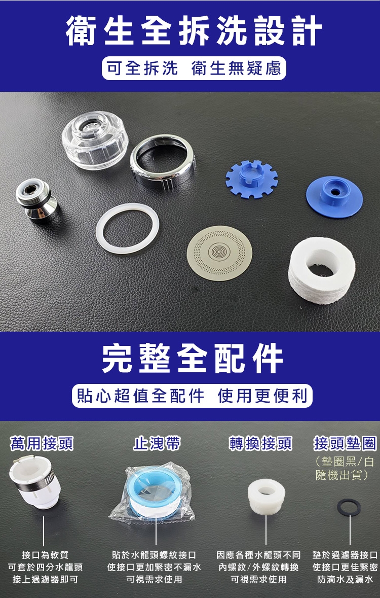 包裝內容物:360度水龍頭過濾器x1、PP濾芯x1、止洩帶x1、萬用接頭x1、轉換接頭x1、接頭墊圈x1