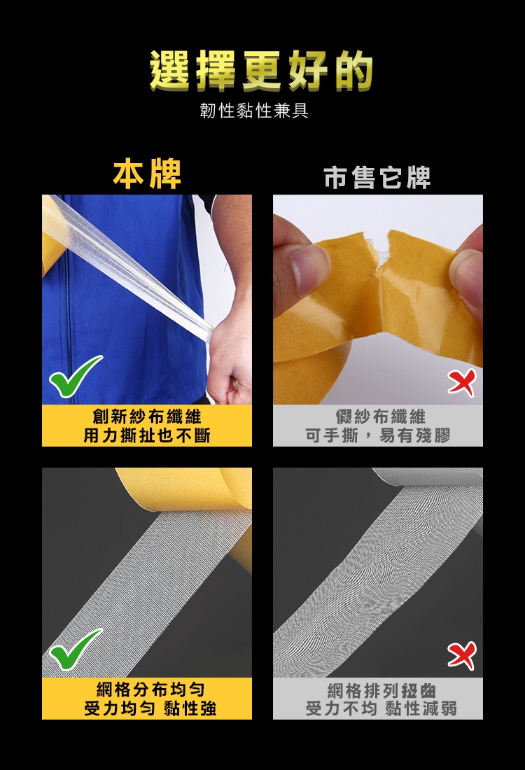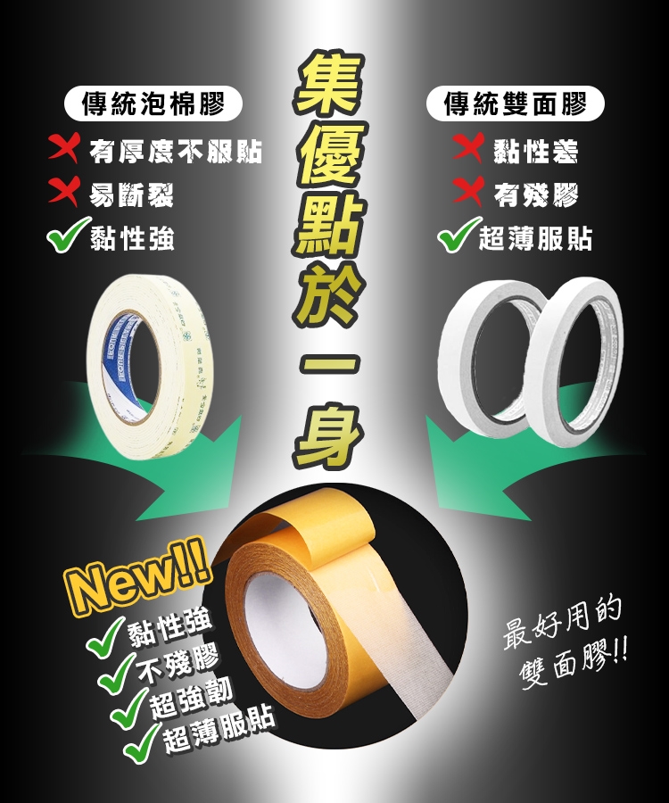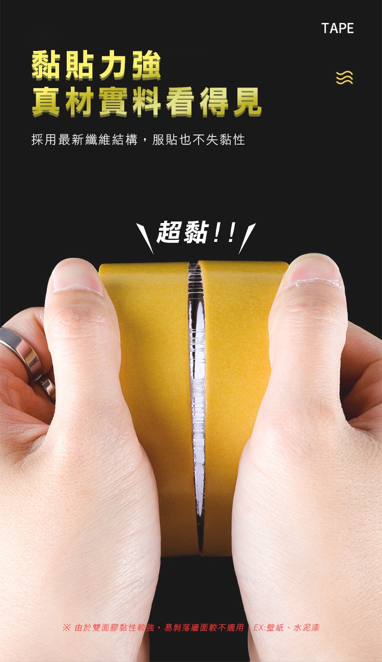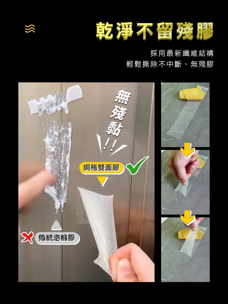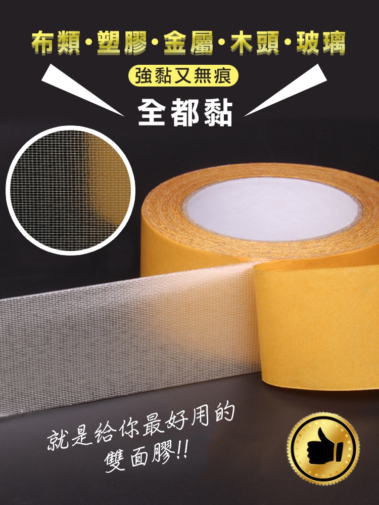 創新強韌網格雙面膠,有別於傳統泡棉膠跟雙面膠,新升級紗布纖維,韌性佳,用力撕扯也不斷,採用最新網格纖維科技,輕薄貼合也不失黏性。黏性強,撕下無痕 乾淨不留殘膠!小小一捲滿足居家各種黏貼需求~ 三種尺寸 隨心挑選! 是居家空間擺設的必備神器唷~~