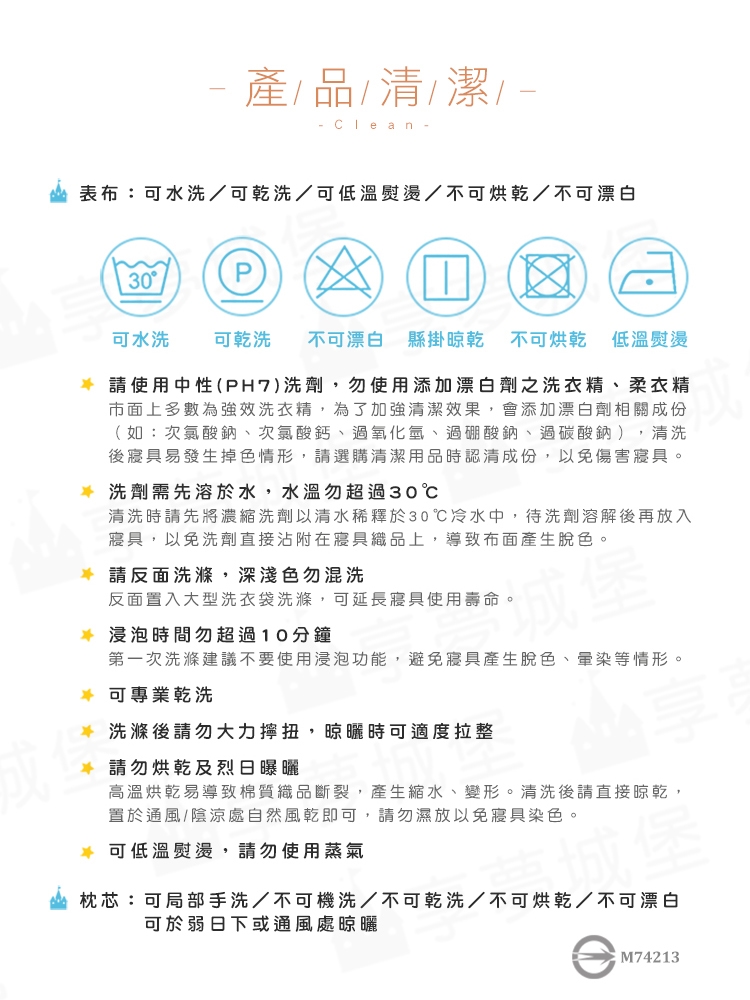 .中性清潔劑:為了保護寢具的壽命請選用(PH值為7)的清潔劑,勿使用含漂白成份或強效護色之洗劑或柔軟精。