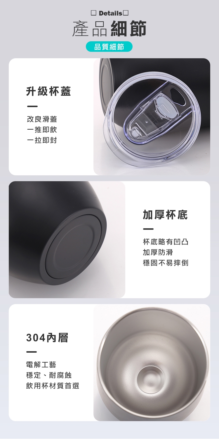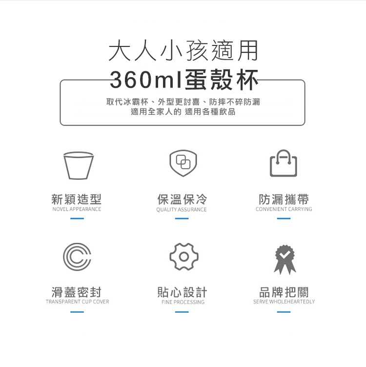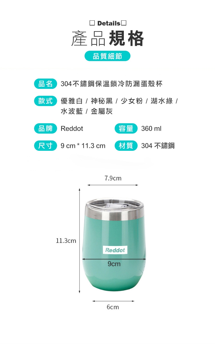 輕巧便攜304不鏽鋼保溫鎖冷蛋殼杯。取代傳統冰壩杯笨重且外出占空間,新穎蛋殼造型,外觀更討喜。防摔防漏設計 老、中、青三代皆宜!食品用304不鏽鋼設計,保溫鎖冷,一年四季皆適用。耐腐蝕、易清洗、不藏汙,安心使用!新升級滑蓋杯蓋,一推即飲 也可以搭配吸管使用!多款繽紛色系,可任君挑選唷~