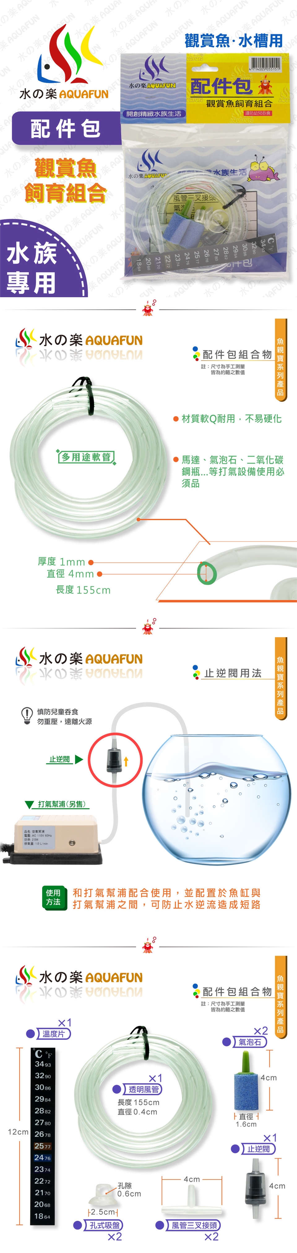 ● 內容物:溫度片×1、透明風管×1、止逆閥×1、氣泡石×2、風管三叉接頭×2、孔式吸盤×2