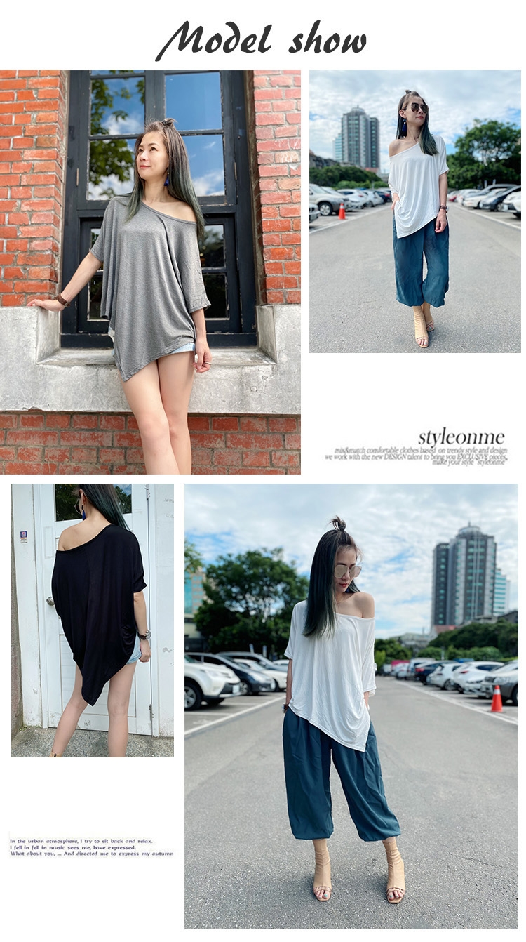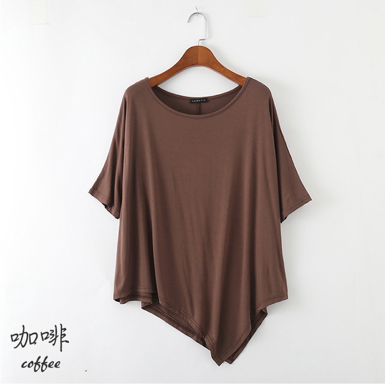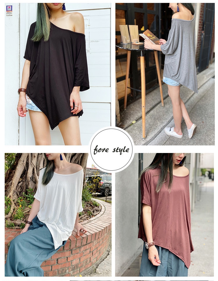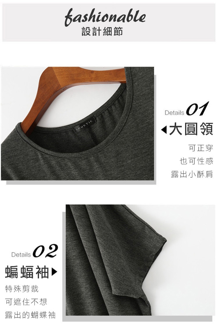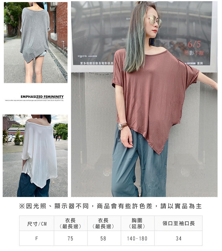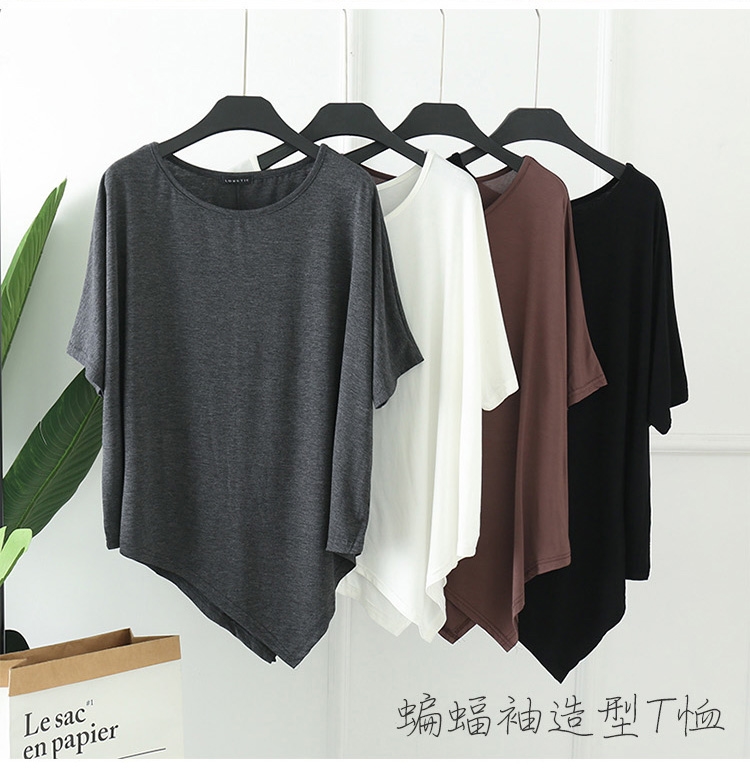 新款莫代爾寬鬆蝙蝠袖造型T恤,選用特級莫代爾材質,舒適好穿,透氣再升級,涼爽不悶熱!寬鬆設計蝙蝠袖,可遮擋煩人的蝴蝶袖,版型長短垂墜感可遮臀部,修飾身材,大領口設計可正穿也可性感小露蘇肩,怎麼穿都有型,簡單搭配出自我風格!夏季必備上衣,經典四色百搭任選!
