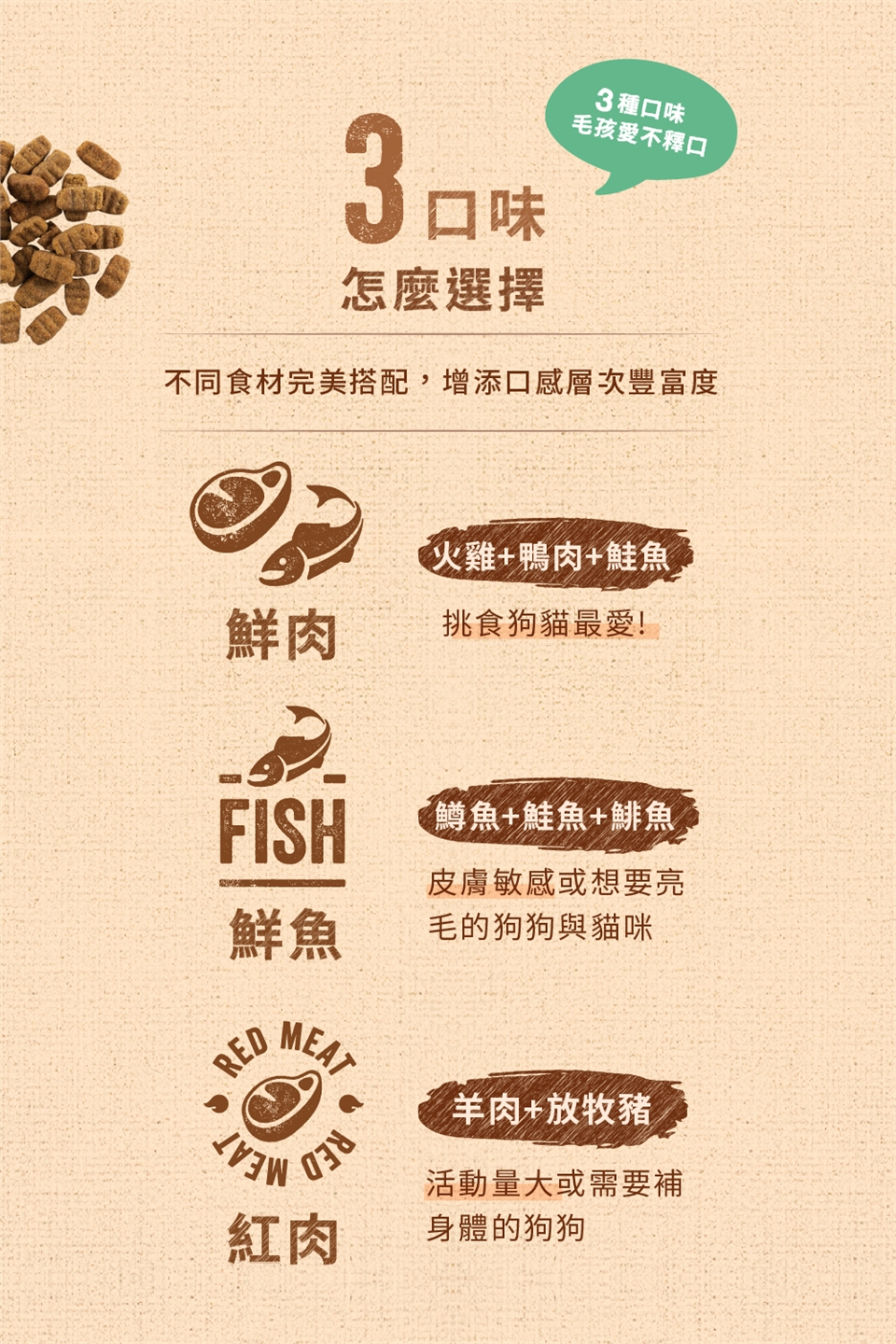 ※選擇寵物食用速度適合的飼料包裝,購買大包裝請裝在密封罐裡以免受潮。