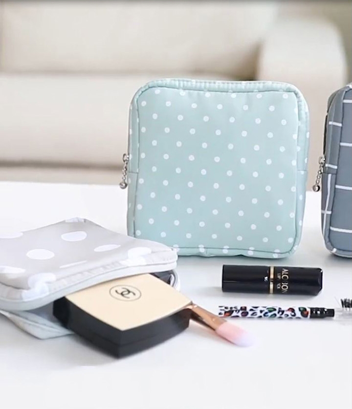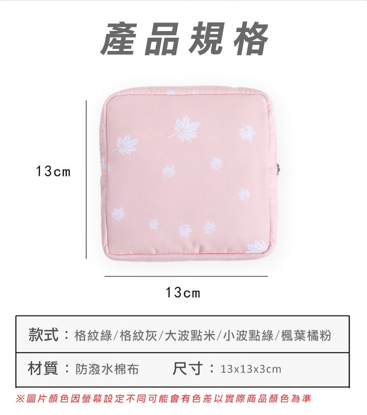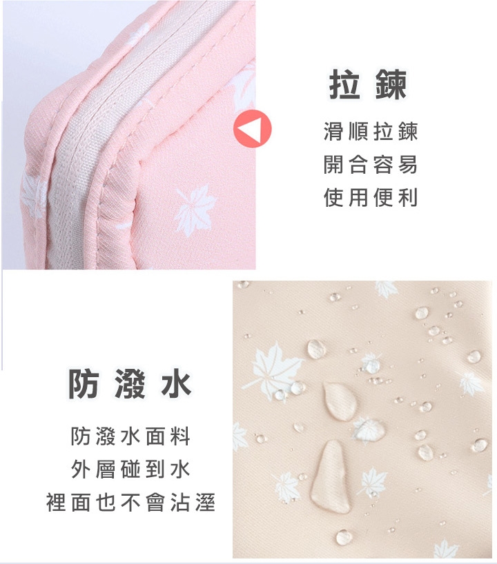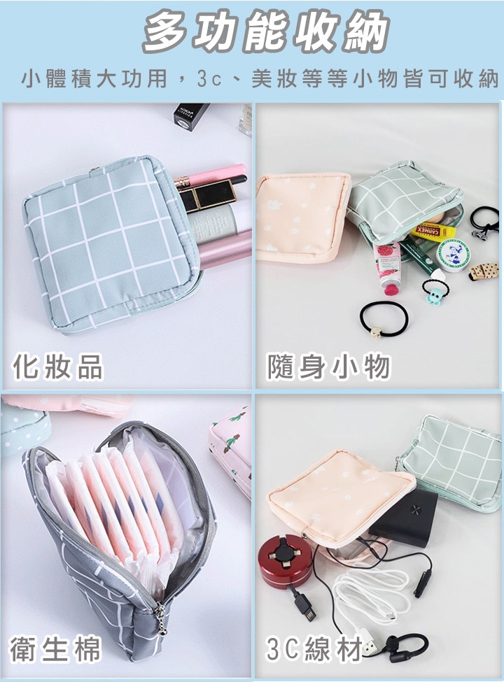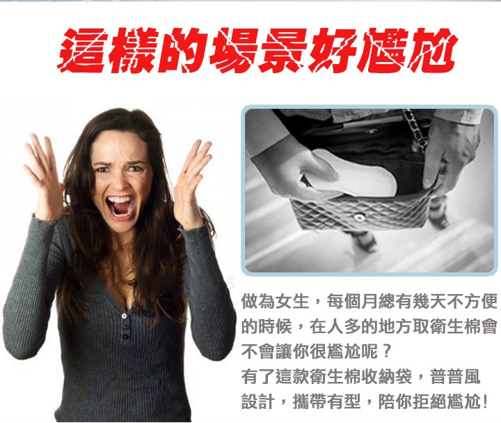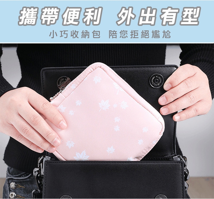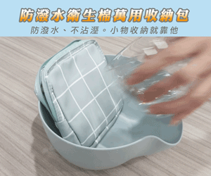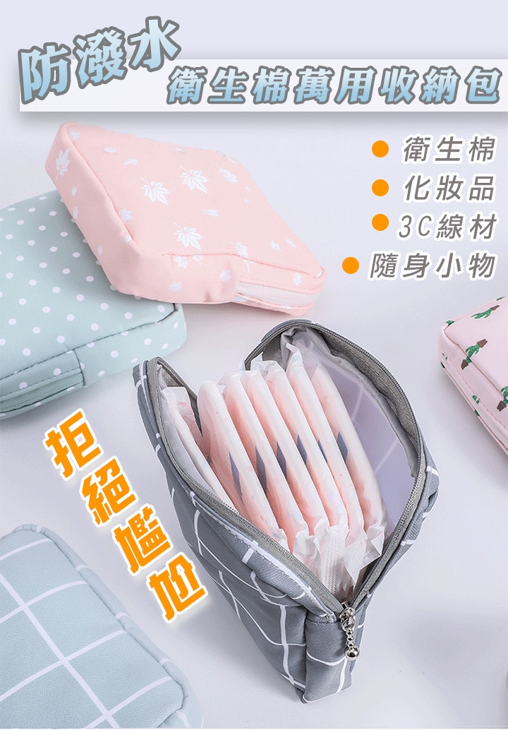 防潑水衛生棉萬用收納包,攜帶有型,保護隱私,陪你拒絕尷尬。防潑水設計防污好清洗,不怕內層沾濕。除了可收納衛生棉和衛生紙,也可收納隨身小物、放置化妝品、零錢、藥品、耳機傳輸線等等