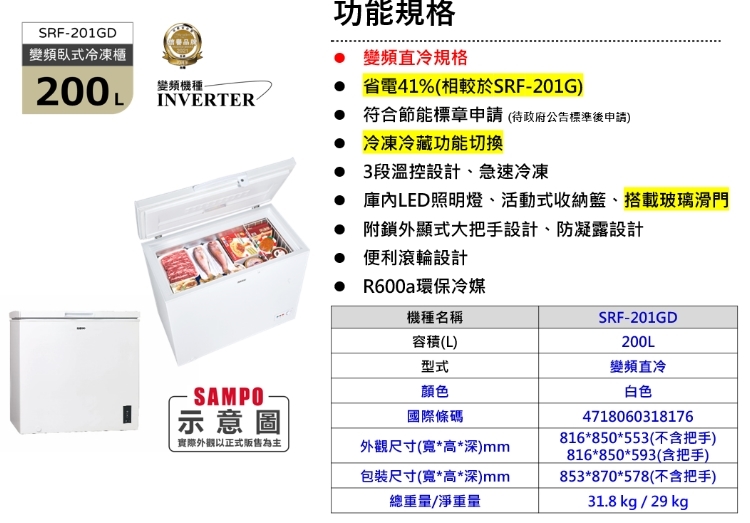 庫內LED照明燈、活動式收納籃、搭載玻璃滑門
