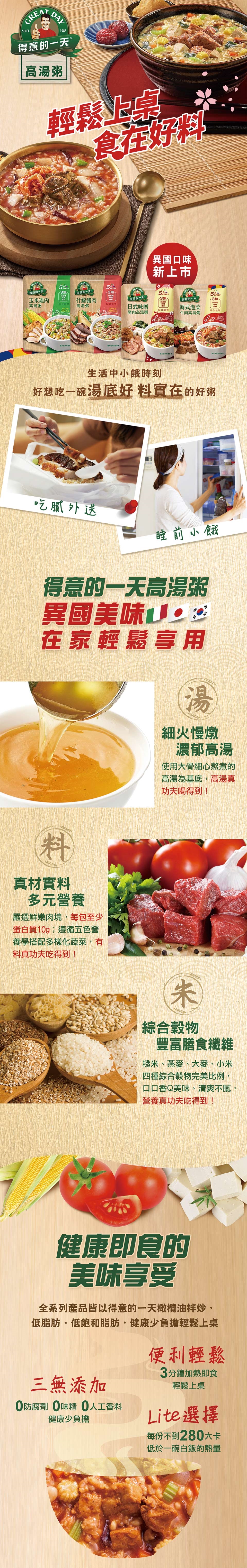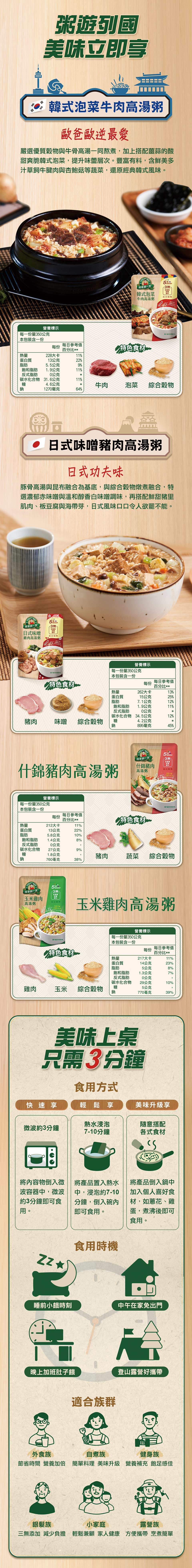 豬高湯[水、濃縮豬骨高湯(豬骨、水、維生素E-抗氧化劑)]、豬小里肌肉、綜合穀物(糙米、燕麥、大麥、小米)、綜合蔬菜(洋蔥、鴻喜菇、玉米筍、西芹、胡蘿蔔、黑木耳絲、海帶芽)、綜合味噌(白味噌、細味噌、赤味噌)、板豆腐、鰹節抽出物[鰹節抽出物(水、酒精、鰹節)、食鹽、鰹魚抽出物、酵母抽出物(酵母、糊精、食鹽)]、蔗糖、昆布抽出液[昆布抽出物(昆布、水)、糊精、食鹽、小麥水解蛋白、酵母抽出物]、橄欖油、柴魚粉、香蒜粉、白胡椒粉、酵母抽出物、老薑粉、黑胡椒細粒、維生素E-抗氧化劑。