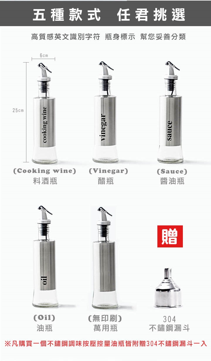 款式:料酒瓶(cooking wine)/油瓶(oil)/醬油瓶(sauce)/醋瓶(vinegar)/萬用瓶(無印刷)