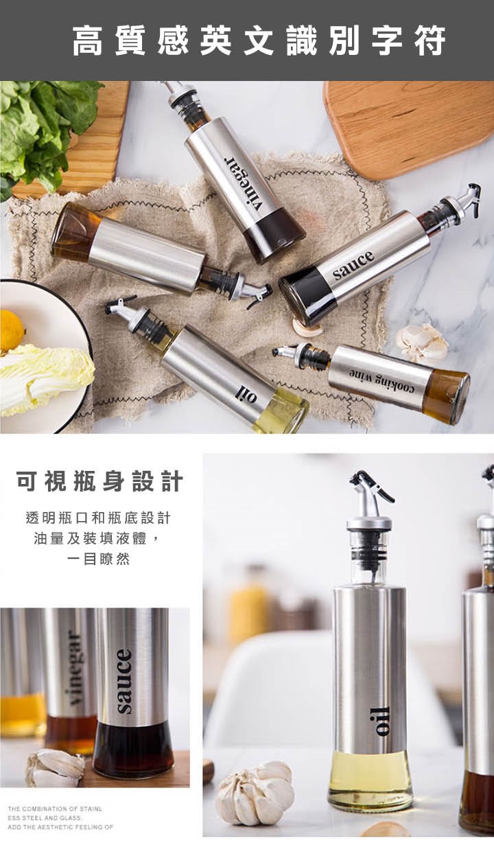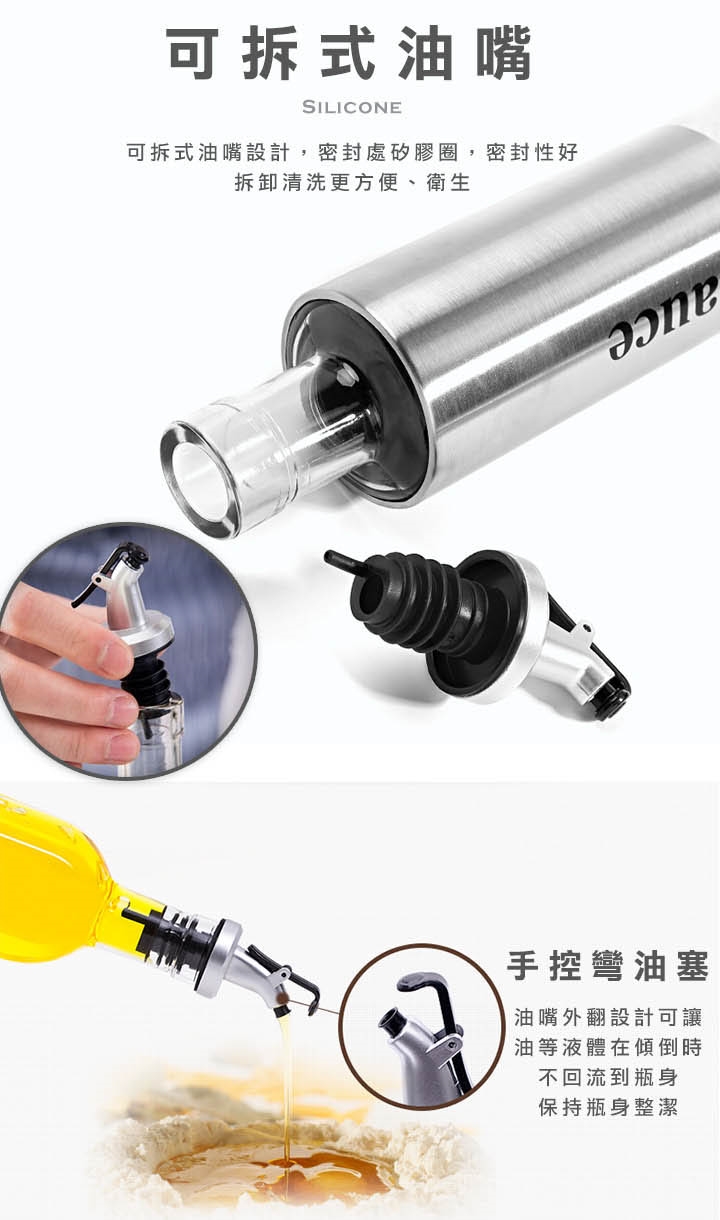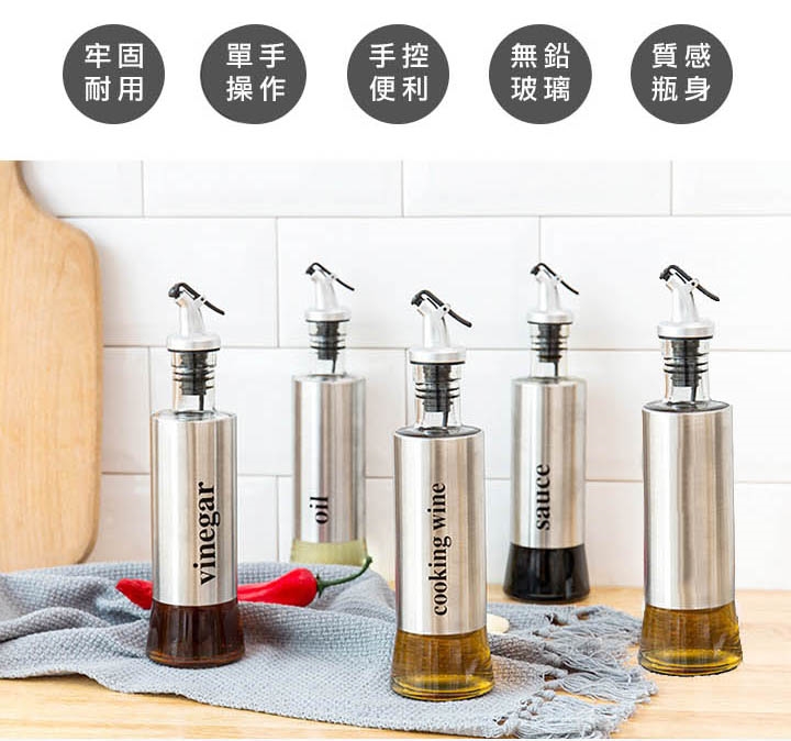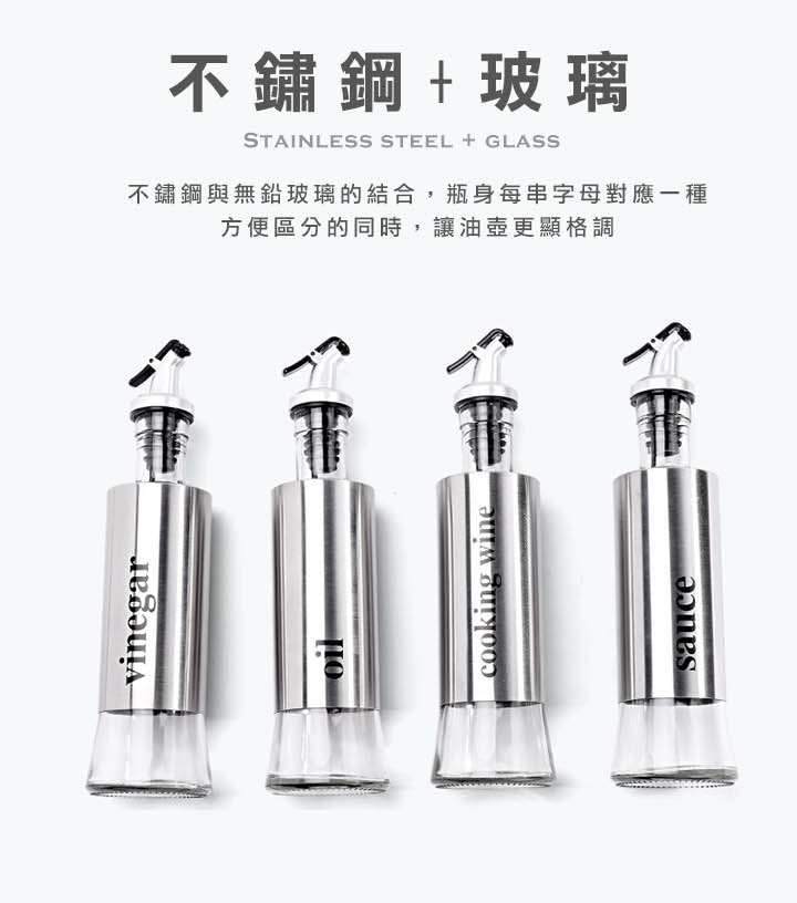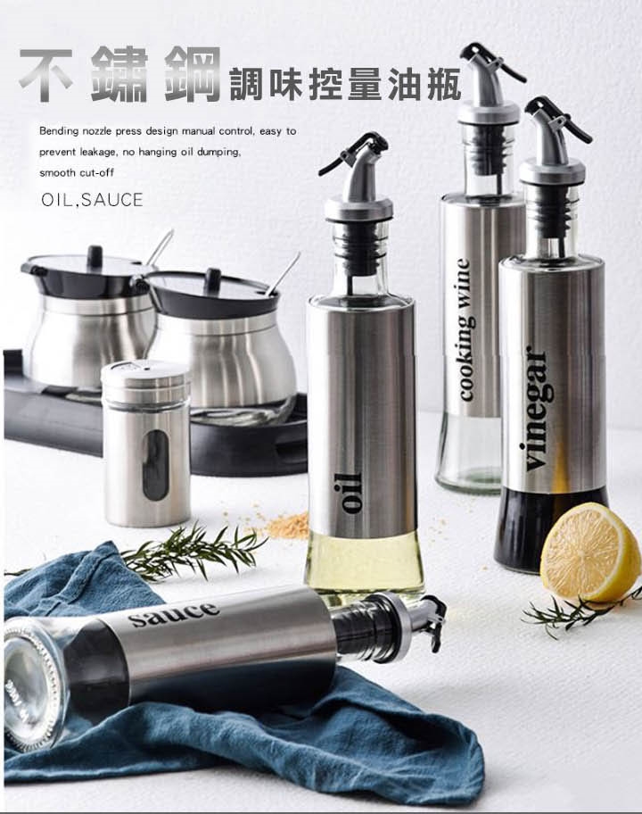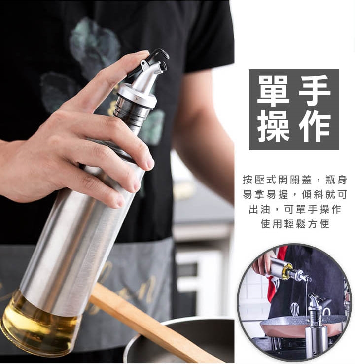 還在擔心不小心失手倒太多毀了精心烹煮的料理嗎?不鏽鋼調味按壓控量油瓶,滿足您的需求。高質感不鏽鋼與無鉛玻璃的結合,使用安心,瓶身英文識別字符,方便區分的同時,讓油壺更顯格調。換氣孔設計 可順暢出油。單手輕鬆操作,手控便利,使用輕鬆又方便,瓶底透明設計,用量一目了然!貼心附贈304不鏽鋼漏斗,裝填醬料超方便