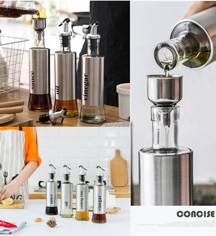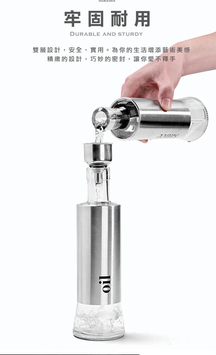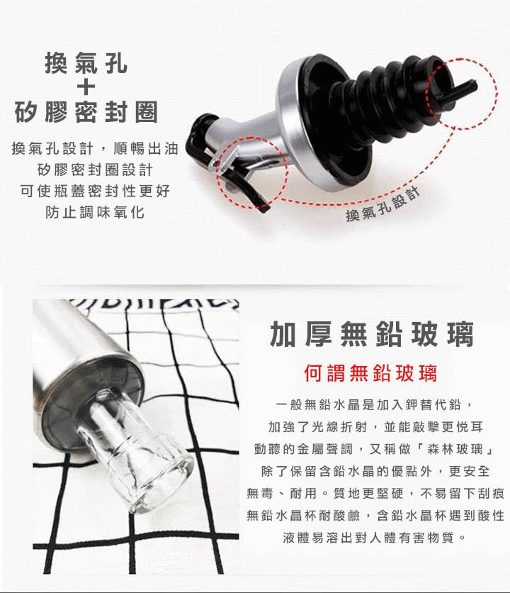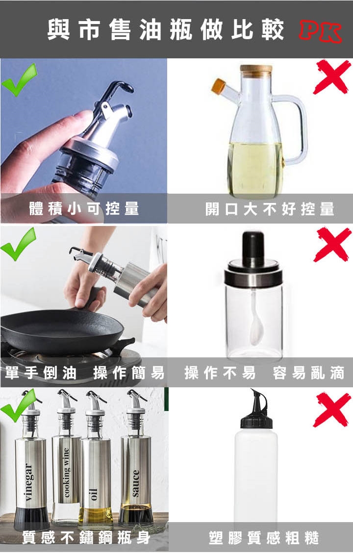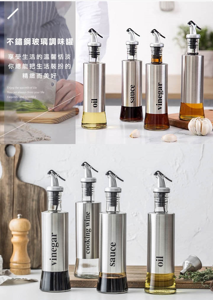 還在擔心不小心失手倒太多毀了精心烹煮的料理嗎?不鏽鋼調味按壓控量油瓶,滿足您的需求。高質感不鏽鋼與無鉛玻璃的結合,使用安心,瓶身英文識別字符,方便區分的同時,讓油壺更顯格調。換氣孔設計 可順暢出油。單手輕鬆操作,手控便利,使用輕鬆又方便,瓶底透明設計,用量一目了然!貼心附贈304不鏽鋼漏斗,裝填醬料超方便