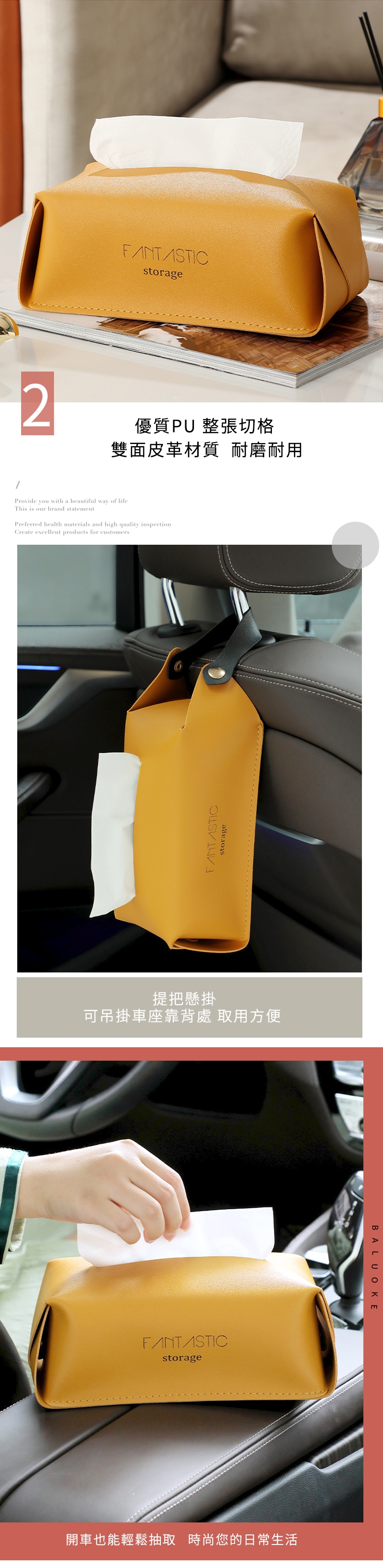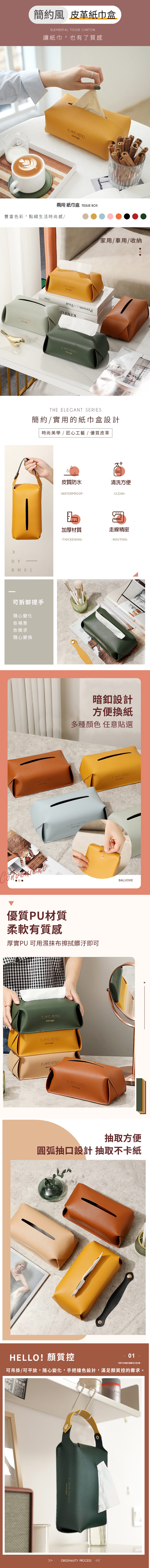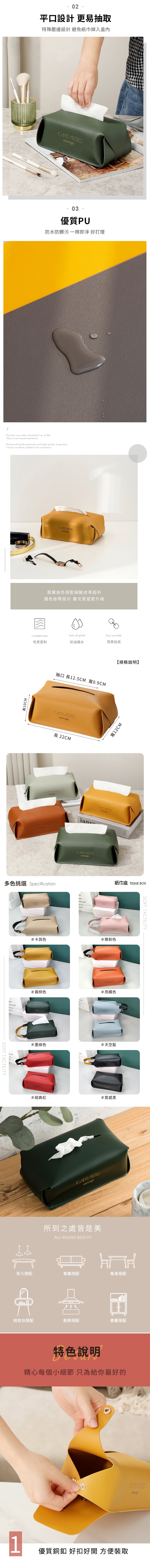 優質PU皮革面料,觸感柔軟霧面高質感,防止紙巾受潮受損,耐磨耐髒好清潔,換紙簡單又快速,可平放可吊掛,各種場景輕鬆駕馭