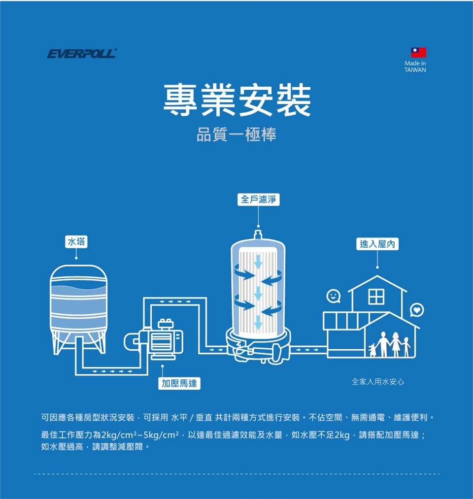 1.最佳工作壓力為2kg/cm2~4kg/cm2,以達最佳過濾效能及水量,如水壓不足2kg請搭配加壓馬達/如水壓過高超過4kg/cm2請裝設減壓閥以免造成危險(以上零件耗材現場報價收費)