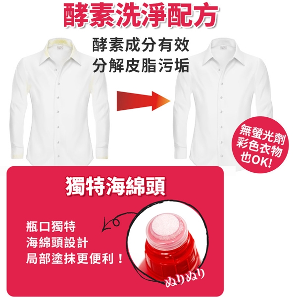 ・最適合清潔衣領袖口等局部髒汙的去污劑 瓶口獨特「海綿刷頭」塗抹更方便。